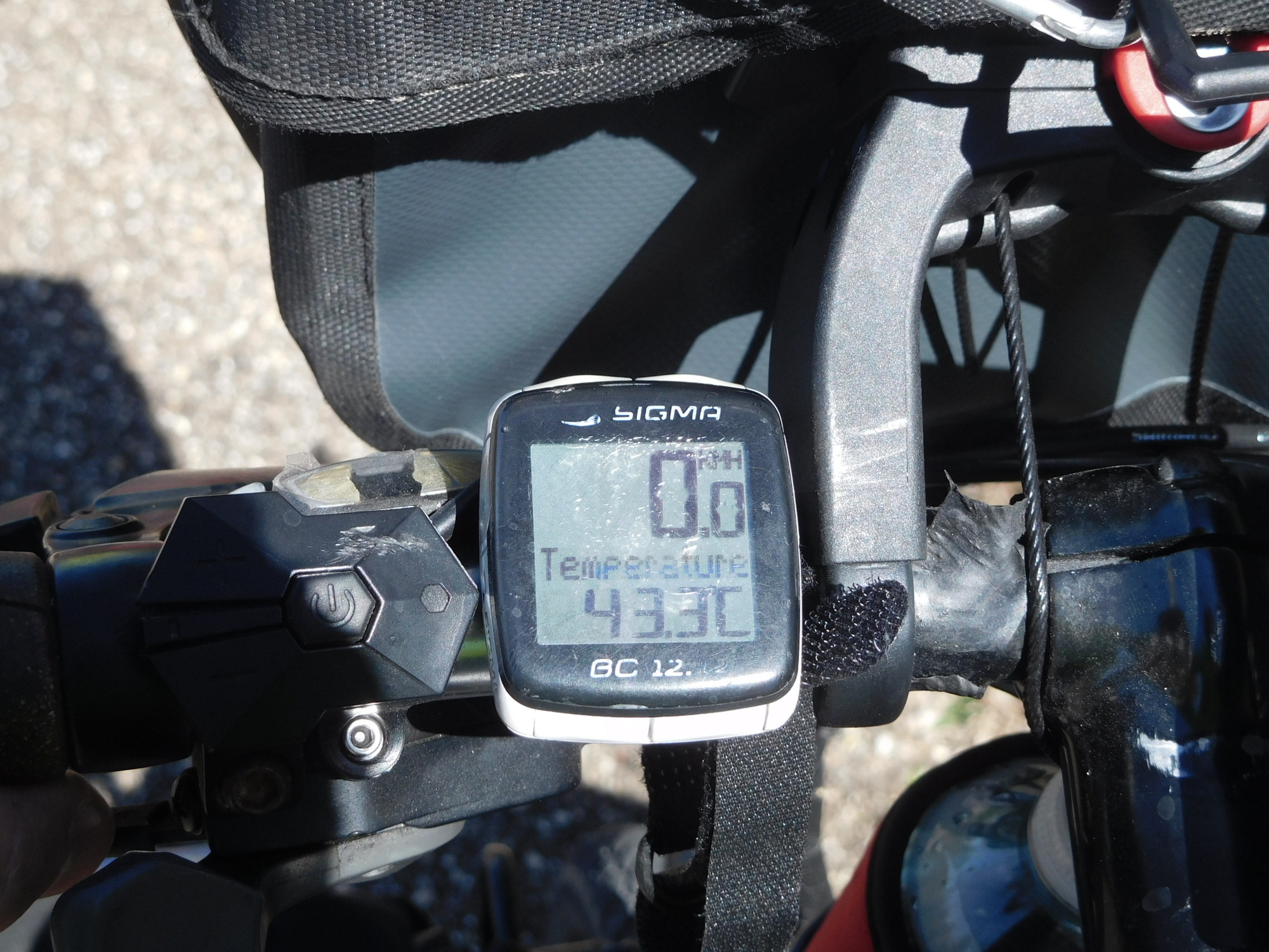 Through this we had the "Puuc Hills" which in general were quite moderate. However the temperature climbed through the day, allowing me to snap a photo of my handlebar thermometer, which was in the shade of my body, but still showed over 43 degrees (that's a toasty 110 degrees F).