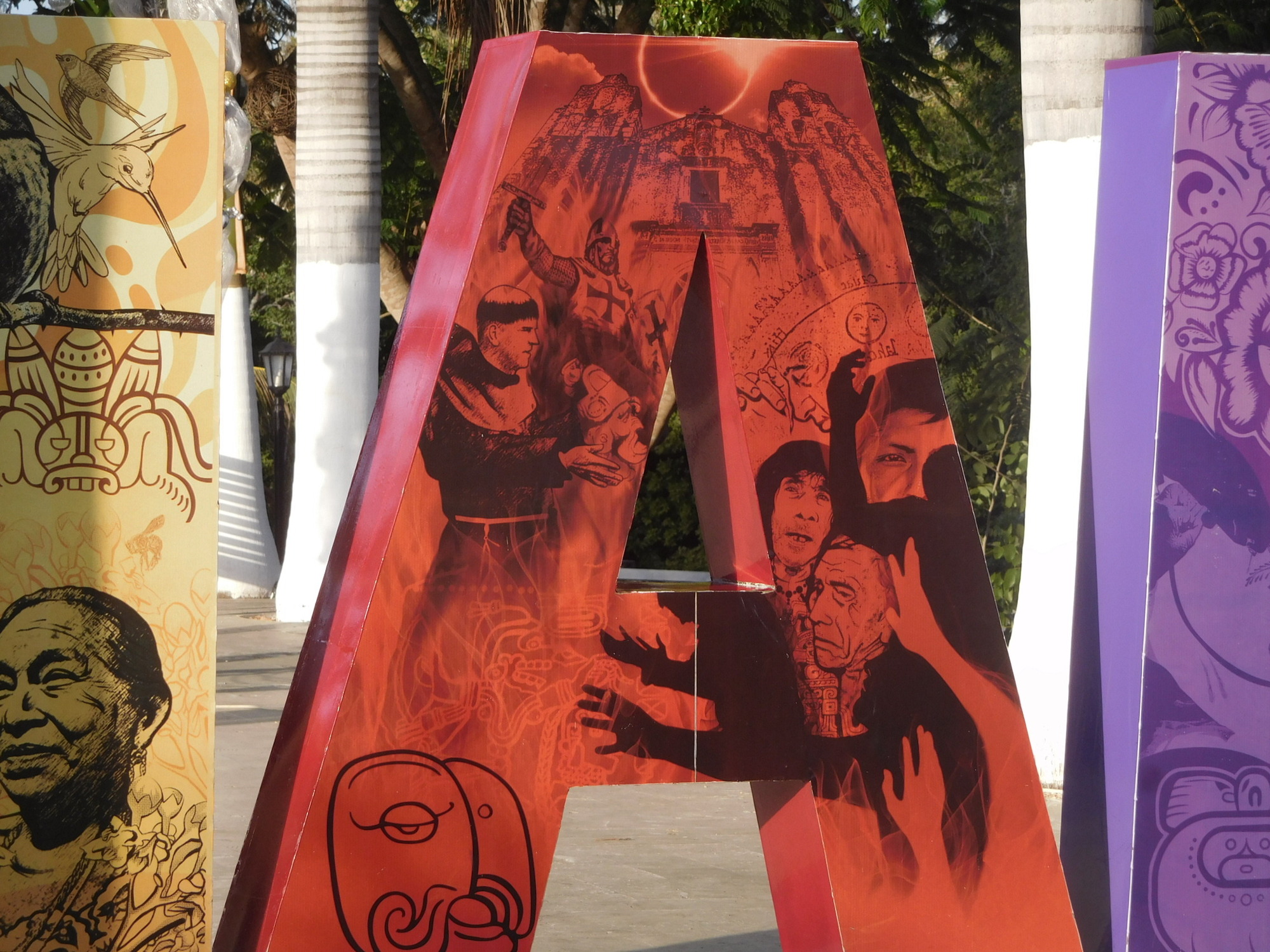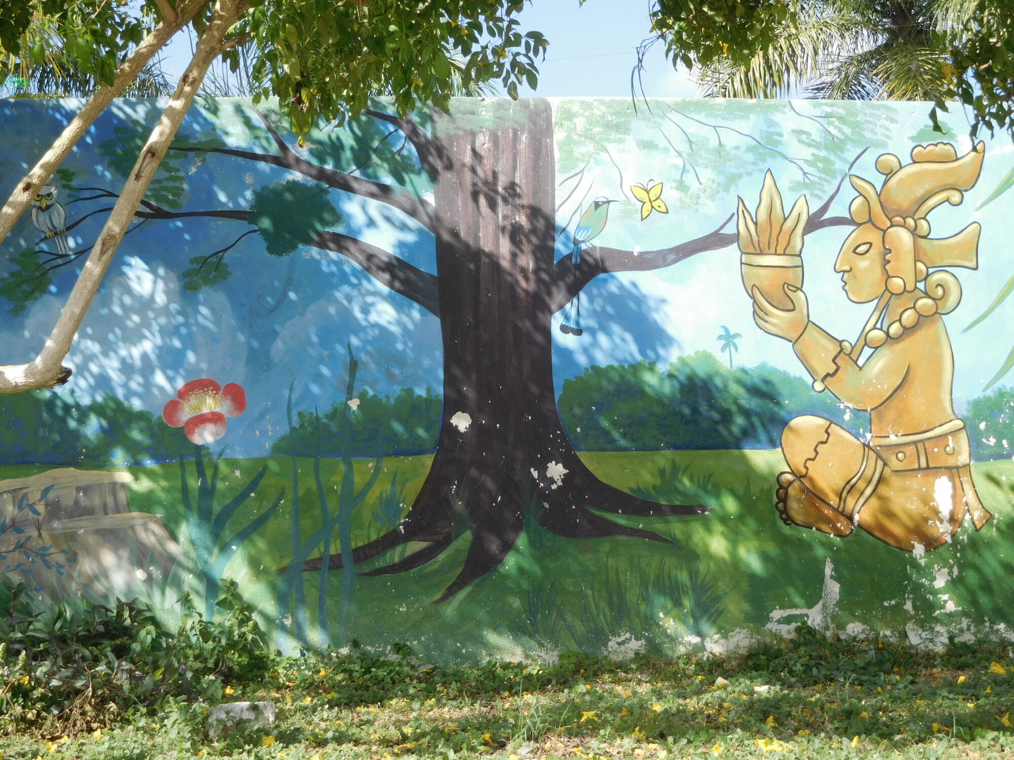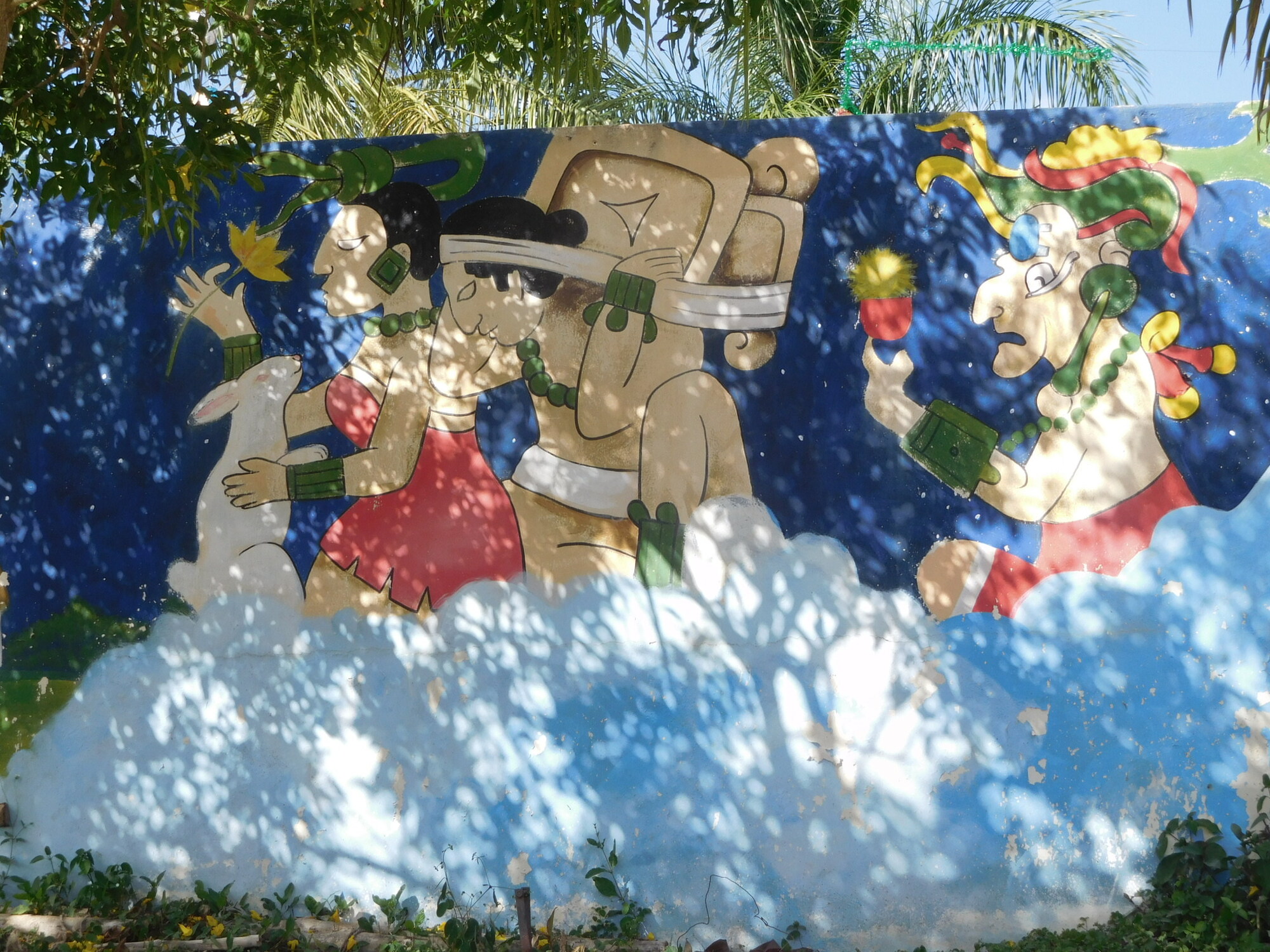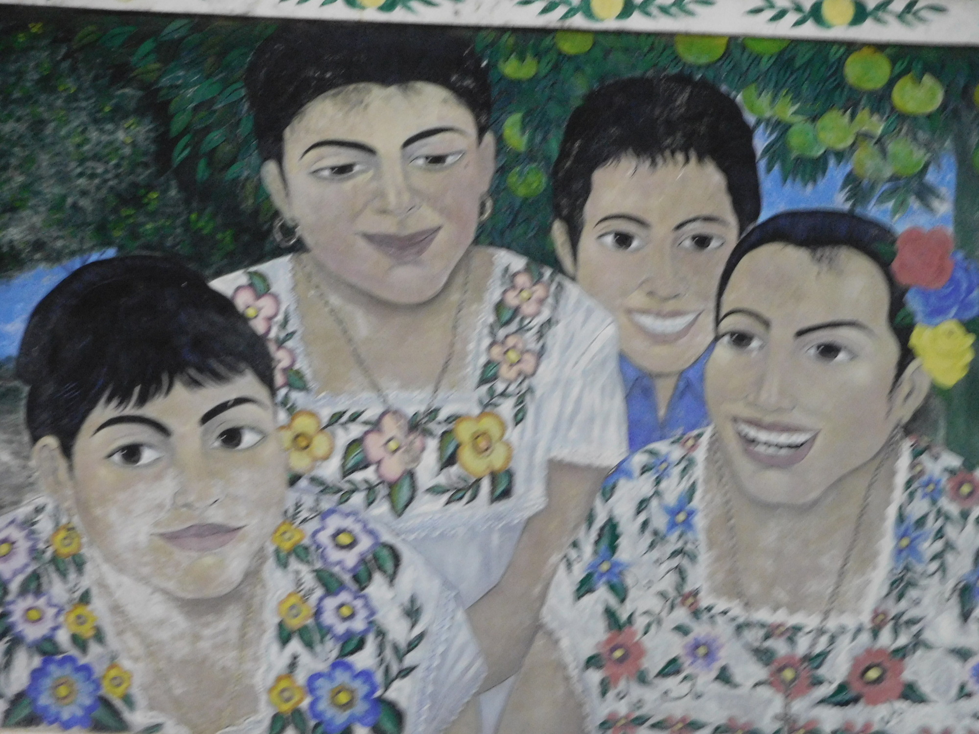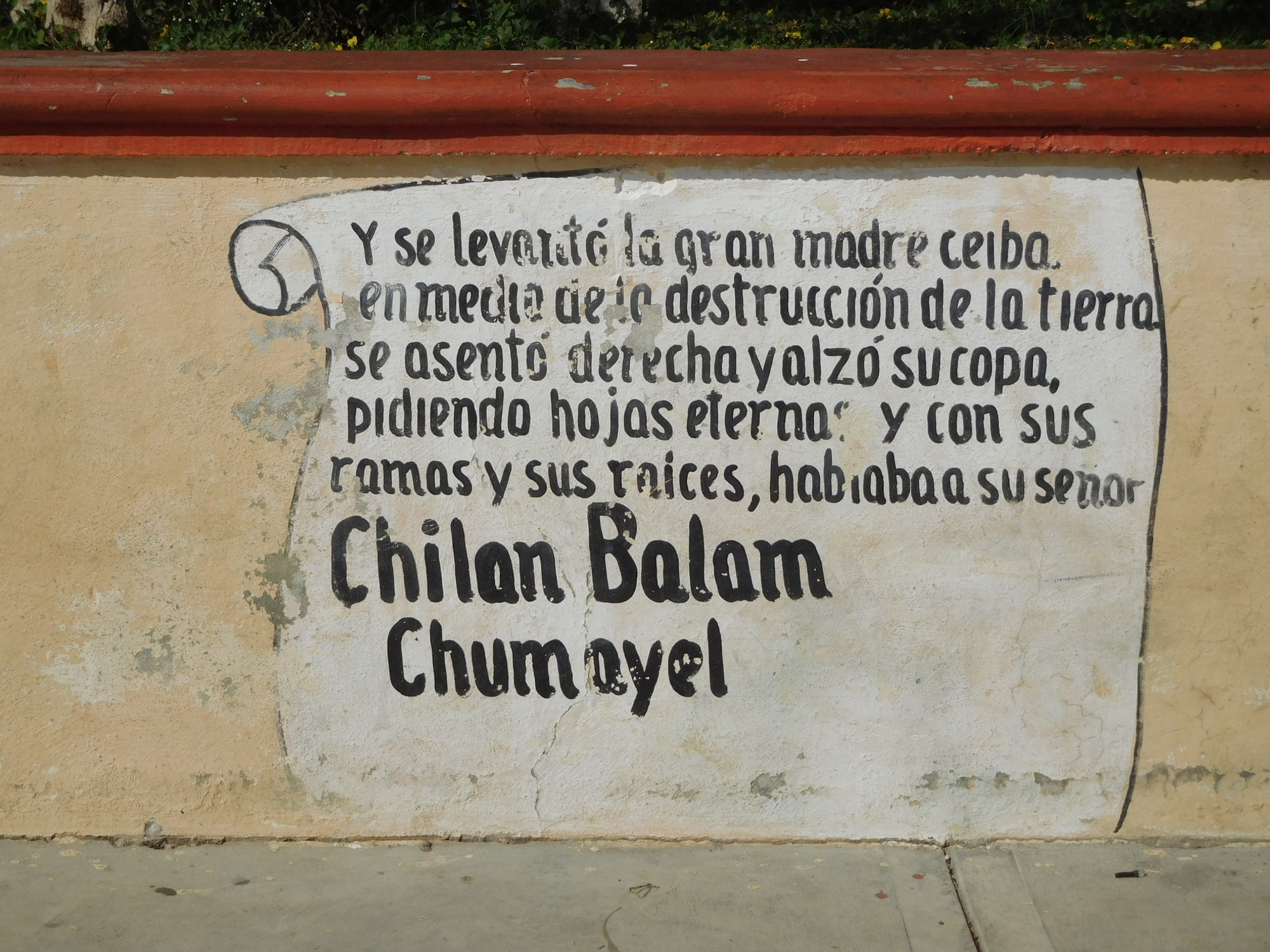 Chumayel is the town where the sacred book of the Maya, the Chilan Balam was kept. There is a quote from it on a sign in the square by the church - mentioning the great mother ceiba tree. There also are some murals depicting the harvest and the Mayan gods and people.