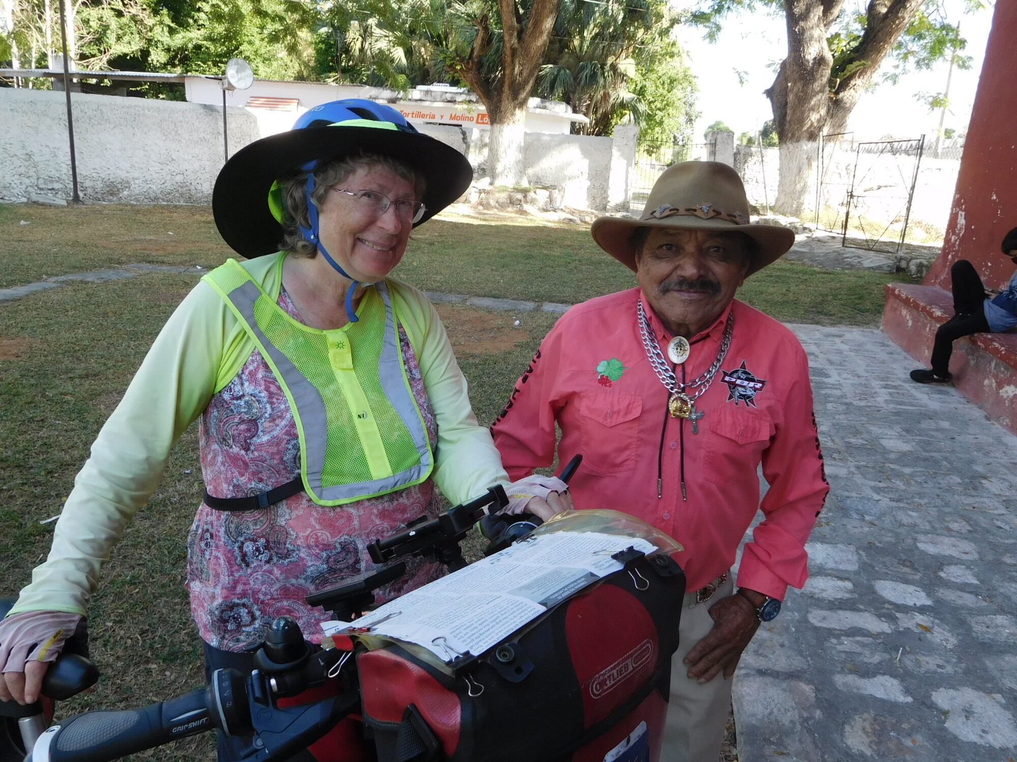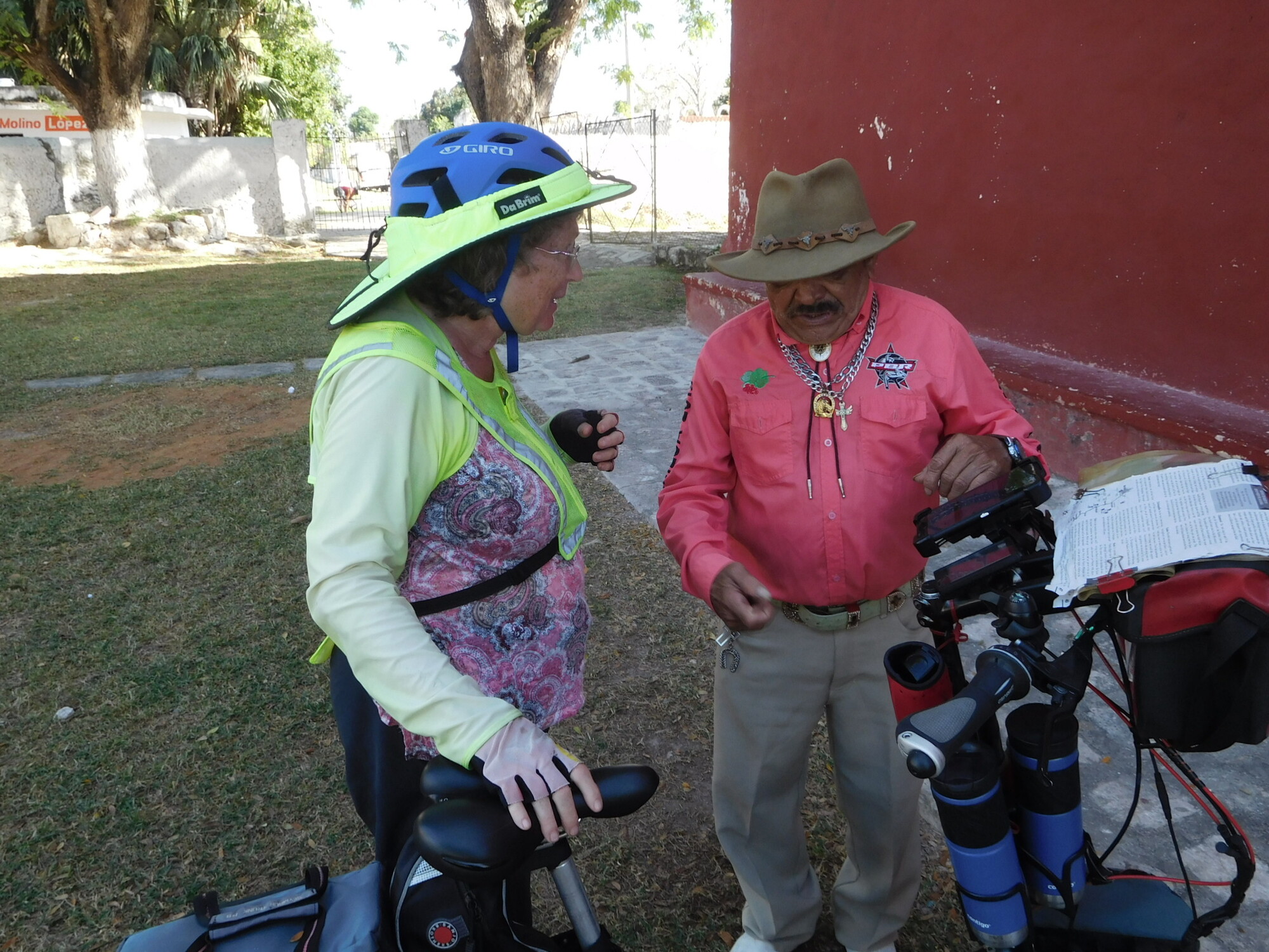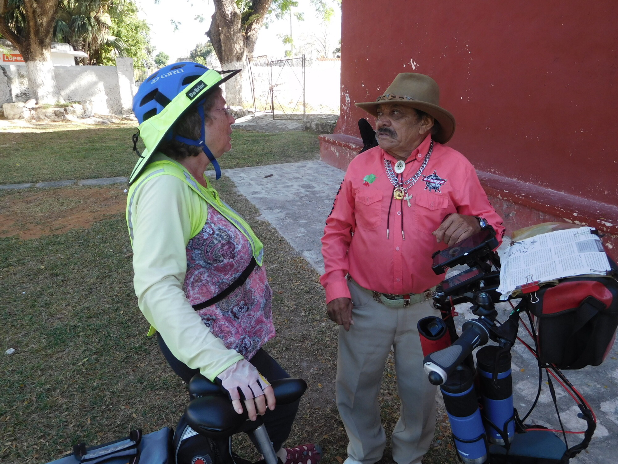 But it was outside the church that the most interesting thing happened. Some people were beginning to gather for a service, and a frail little old couple tottered up and sat down on a ledge outside. The man was wearing some fancy clothes, seemingly souvenirs of a Virgin of Guadeloupe pilgrimage. I am not sure if we spoke first to the couple, but probably the reverse. What ensued was a 15 minute or longer chat, mostly between Dodie and the man. The man spoke not a word of English, but Dodie has a keen ear and two weeks of Spanish immersion here cycling around. We learned that the couple's son saved up and visited England, and, we think, they also have some children now in Canada. The man was very interested in our trip and the bikes, discussing the gearing and how it is not needed in Yucatan, assuring us that we are perfectly safe among the friendly people of the State, and urging us to drive safely and slowly. He generally warmly welcomed us to his land, and there were nice handshakes all around.
