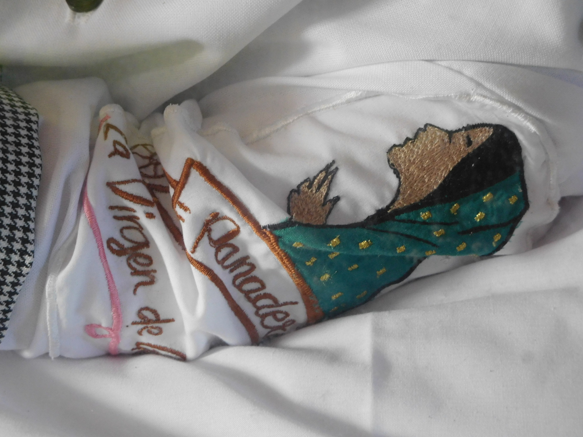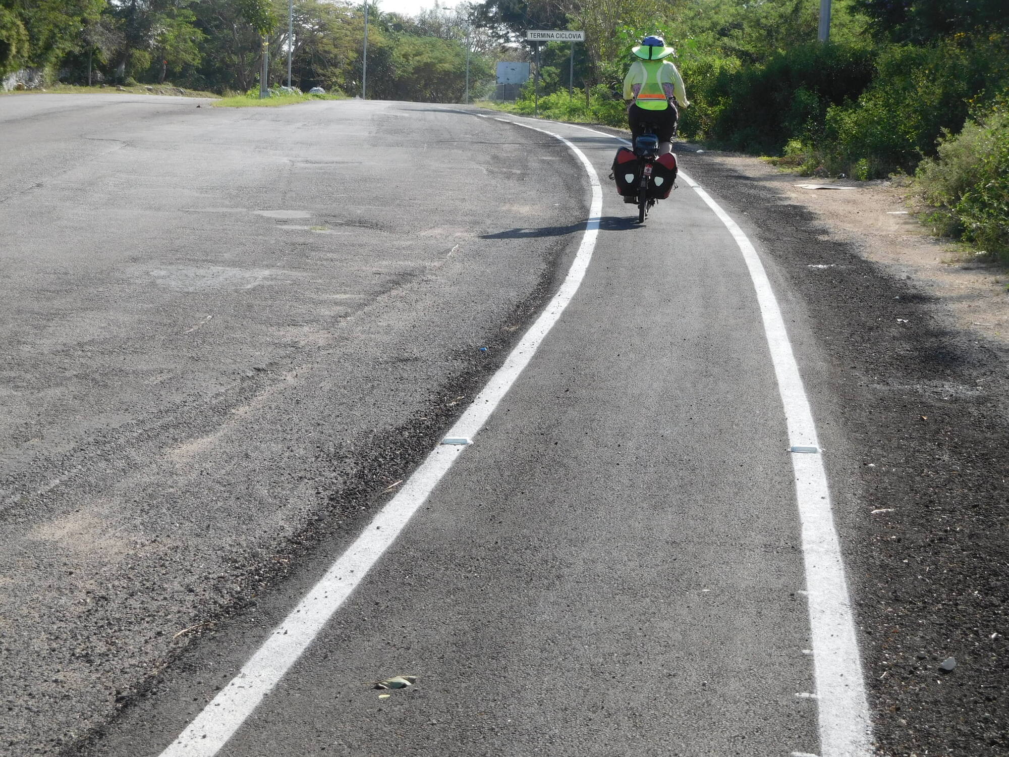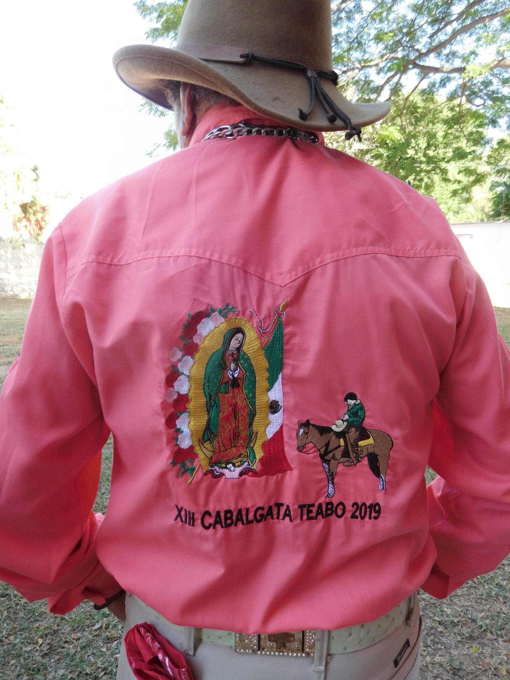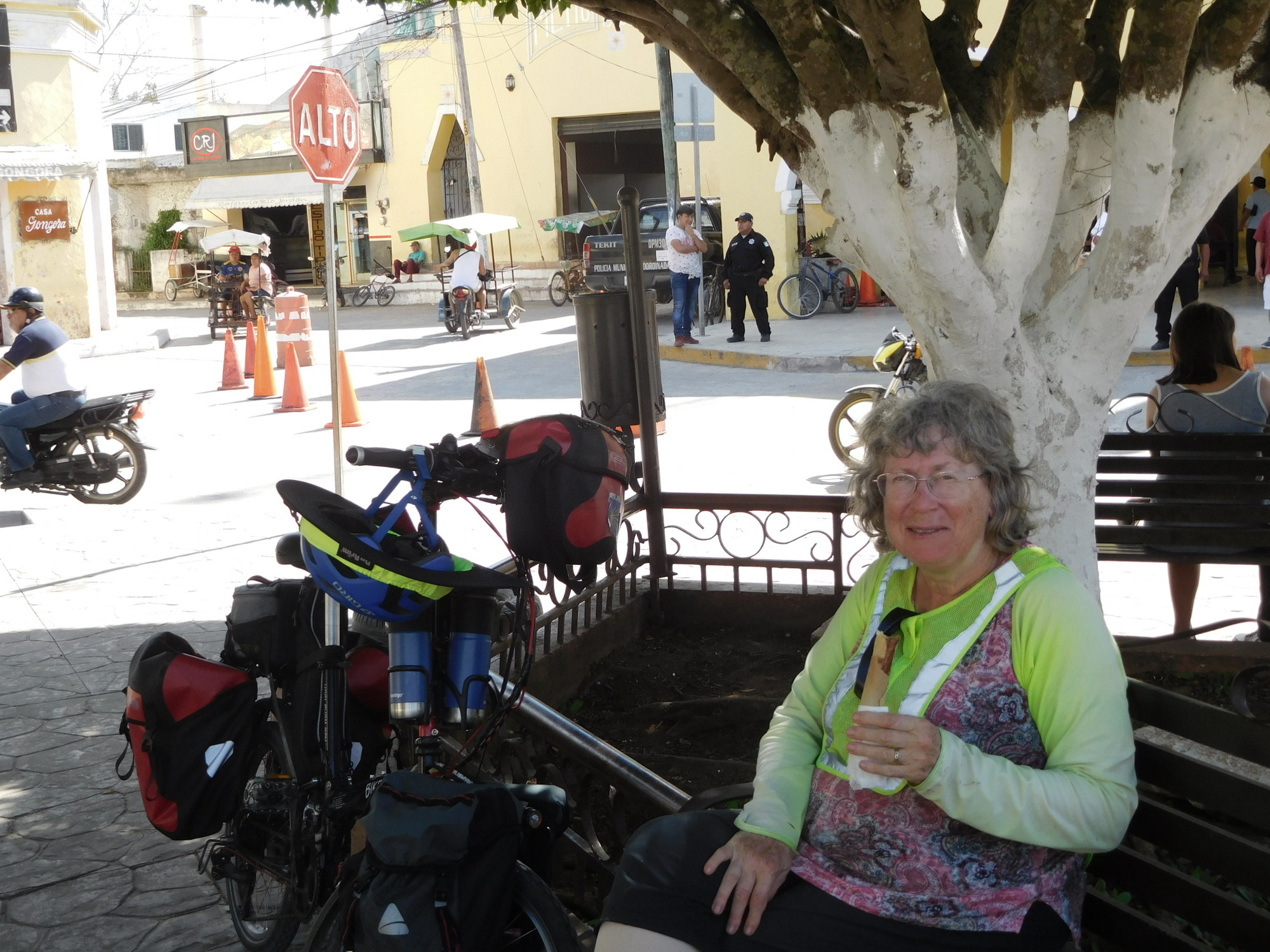 But it was outside the church that the most interesting thing happened. Some people were beginning to gather for a service, and a frail little old couple tottered up and sat down on a ledge outside. The man was wearing some fancy clothes, seemingly souvenirs of a Virgin of Guadeloupe pilgrimage. I am not sure if we spoke first to the couple, but probably the reverse. What ensued was a 15 minute or longer chat, mostly between Dodie and the man. The man spoke not a word of English, but Dodie has a keen ear and two weeks of Spanish immersion here cycling around. We learned that the couple's son saved up and visited England, and, we think, they also have some children now in Canada. The man was very interested in our trip and the bikes, discussing the gearing and how it is not needed in Yucatan, assuring us that we are perfectly safe among the friendly people of the State, and urging us to drive safely and slowly. He generally warmly welcomed us to his land, and there were nice handshakes all around.