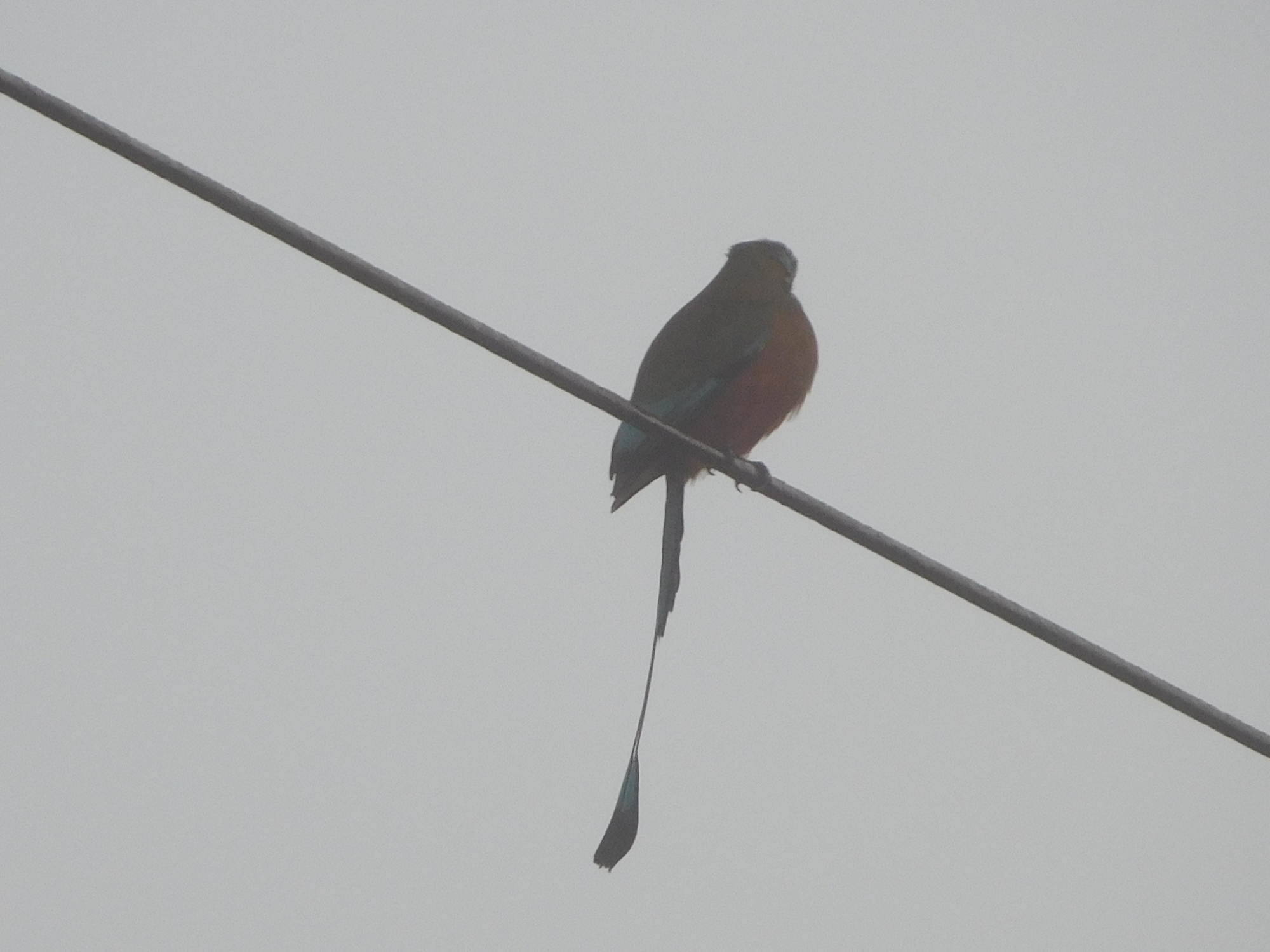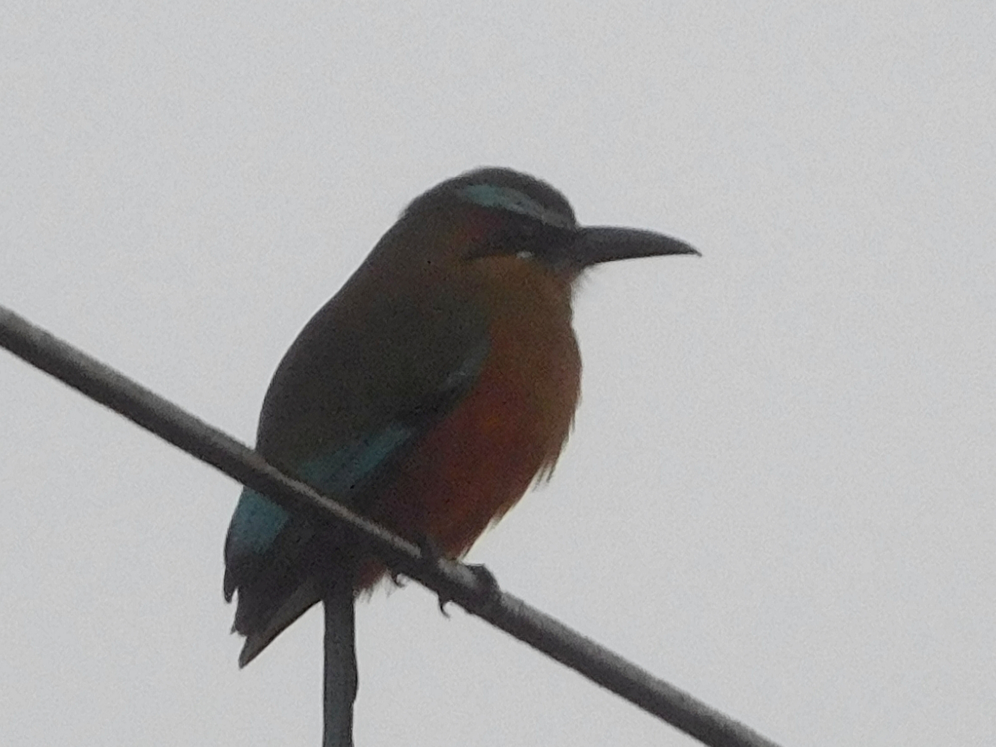 Just out of town, and still in a lot of mist, we spotted our second Motmot. The Motmot has a really distinctive tail, with two feathers extending way down on featherless strands. This appearance makes the bird a natural for appearance on posters and logos.