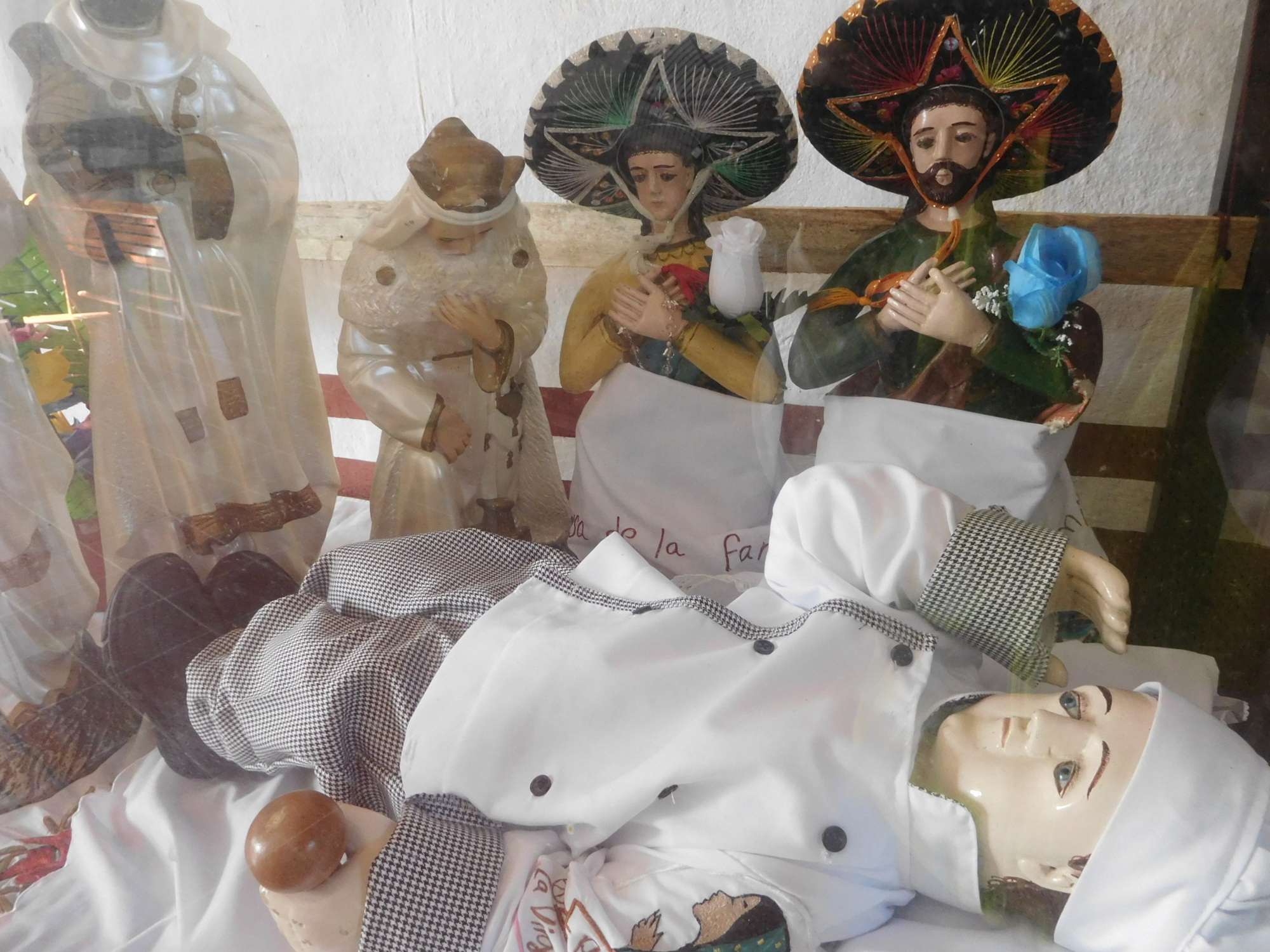Here below is a weird example of what is called syncretism, in which different religions somewhat amalgamate. Here we have the Wise Men, and some other dudes in sombreros! Baby Jesus is also sporting a Virgin of Guadeloupe souvenir shirt!