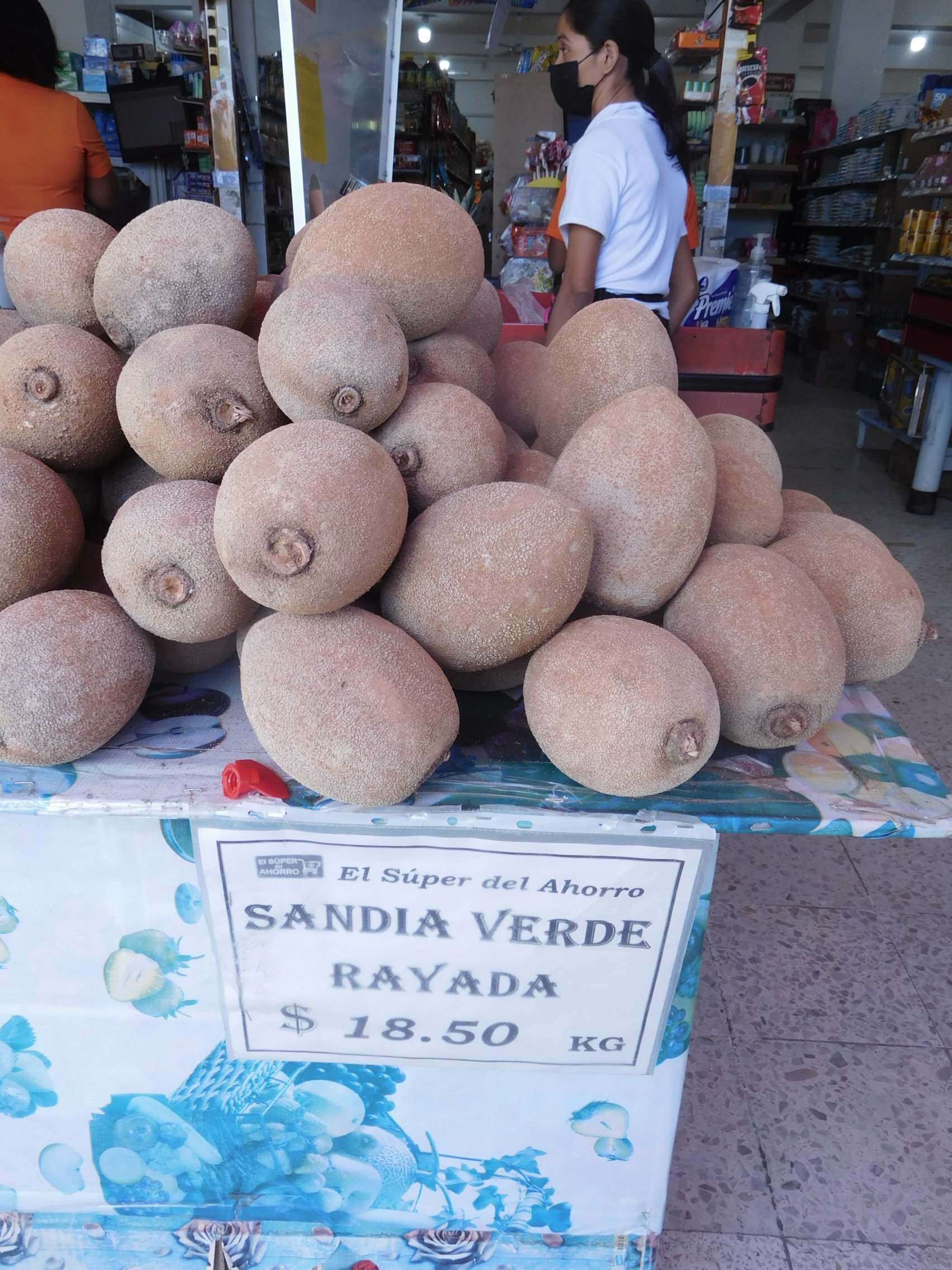 Rested now from the shady bench, we set off for the panaderia, ablock away. We passed a grocery store, today featuring mamey (not watermelon as seemingly on the sign), which is the fruit of the large trees we had earlier noticed, and named sapodilla. Mamey and sapodilla are essentially the same fruit.