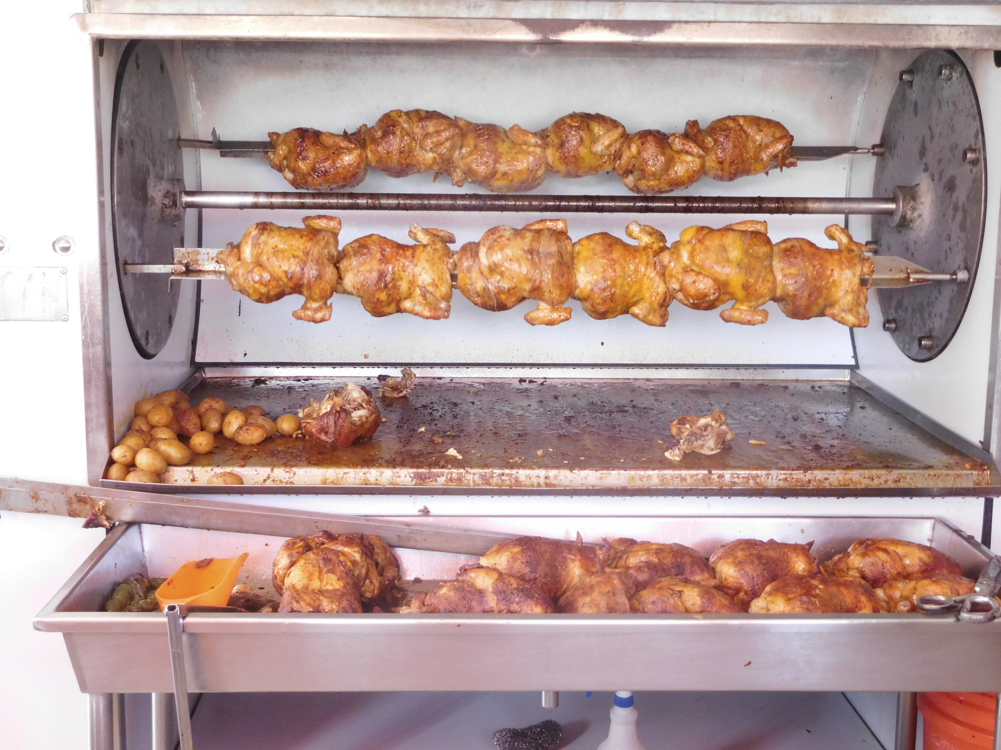 Our final act of resupply was to stop by one of two chicken places. One is using charcoal and a grill, but this time we went for the thing that looks for all the world like it is in France - even down to the potatoes on the bottom.