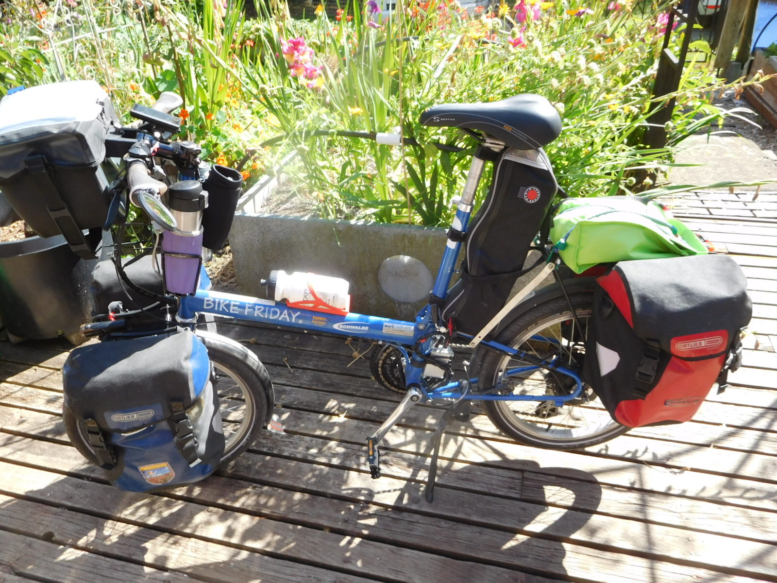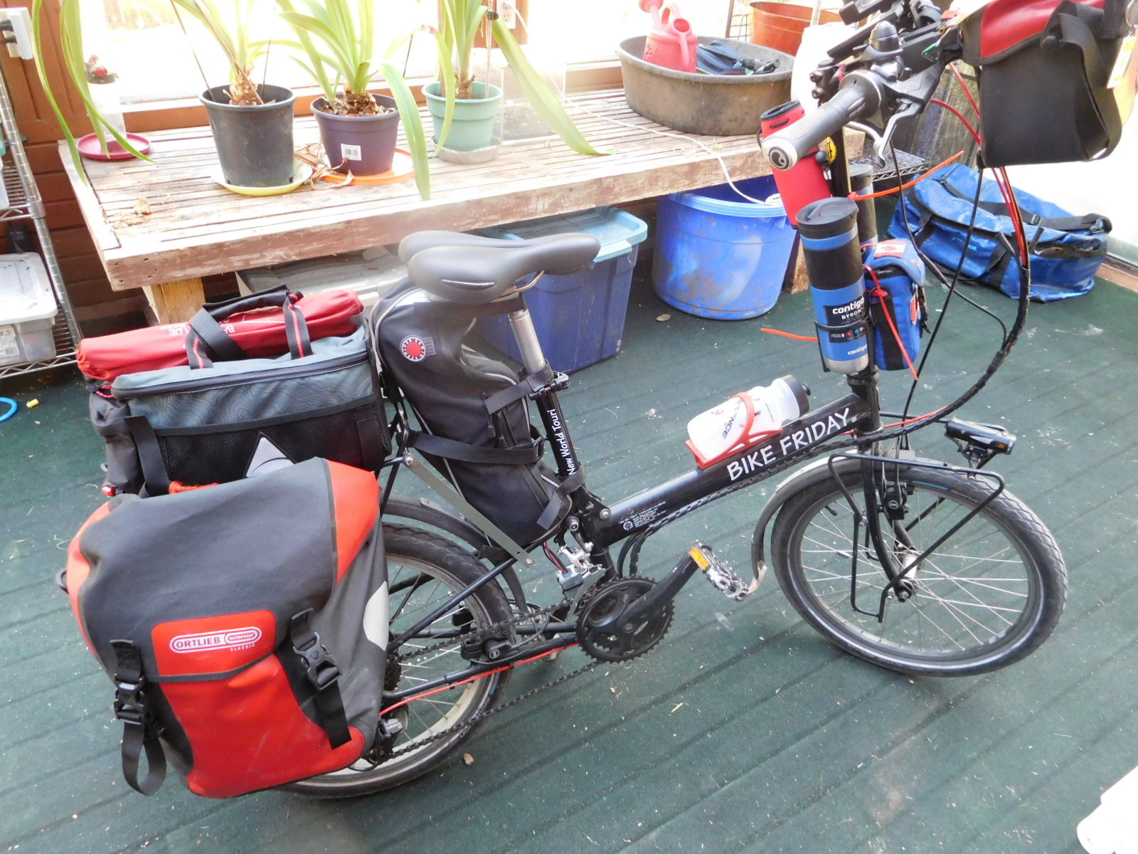 We started out just setting up the Bike Fridays as they would be while on the road, touring. It turned out that we needed the "classical" full complement of rear and front panniers (four panniers per bike), even though we are not camping. A big reason is that we need to carry all sorts of bags in the bags! There are giant plastic bags that house the bikes when they go on the plane, there is a set of bubble wrap sleeves to house the batteries when they go on the plane, and there is a bag to hold the sleeves of batteries. There are giant Walmart bags, that we find convenient for carrying all the other bags up to hotel rooms, and there are smaller Walmart bags to hold the panniers that come on the plane as carry ons. Finally there is a giant duffel that serves as a checked bag.