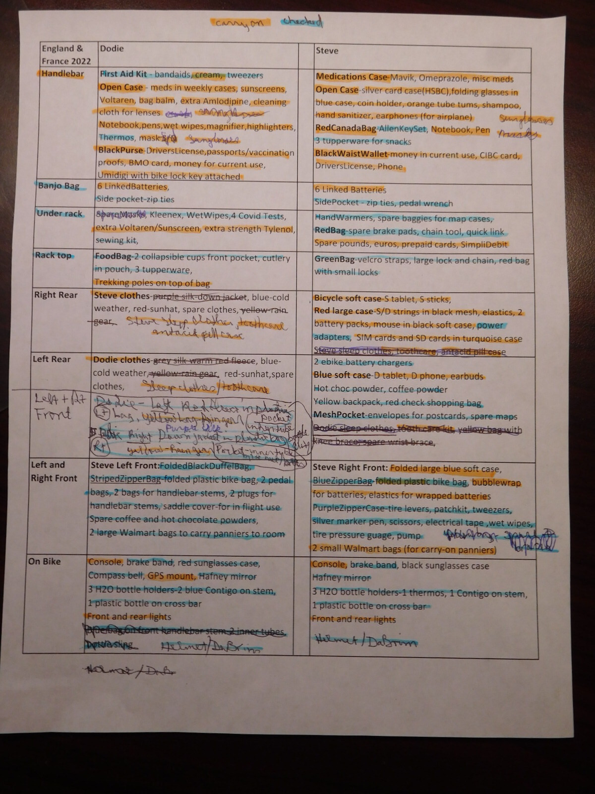 But things get more complicated again when we imagine pedaling in to the airport and asking ourselves what we have to pull out and repack into carry on and checked baggage. Here is a version of our list, in which orange things are carry on and blue ones will be checked! (It's not the details here that we are trying to show, just what a mess the whole topic is.)