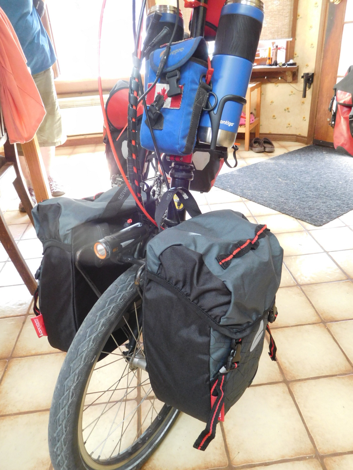 Loading and balancing the bikes is a bit of a daunting task, and with so many panniers (eight plus two handlebar plus one trunk bag plus two battery bags, equals at least thirteen locations) it can be a chore to remember where certain stuff is stored. We addressed this by writing down where everything is. Now we have to remember where we stashed the list!