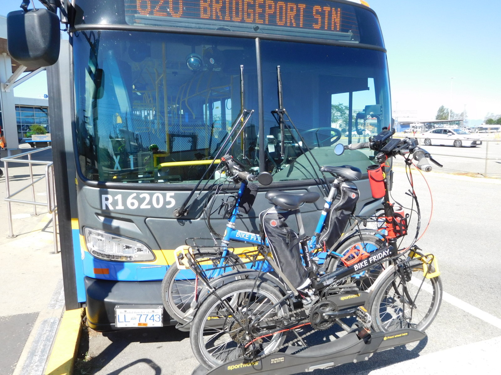 It is not really hard to get from our place to the Vancouver airport, but there is one unpassable barrier - the Massey Tunnel. Unless one can handle a 50 km detour, its necessary to take a bus through. The bus is called the 620, and it goes from the Tsawwassen ferry terminal to the Bridgeport Station, almost at the airport. The 620 is the point of worry for the trip. Not only is it often crowded, but there is the bike rack, for just two bikes, on the front of the bus.