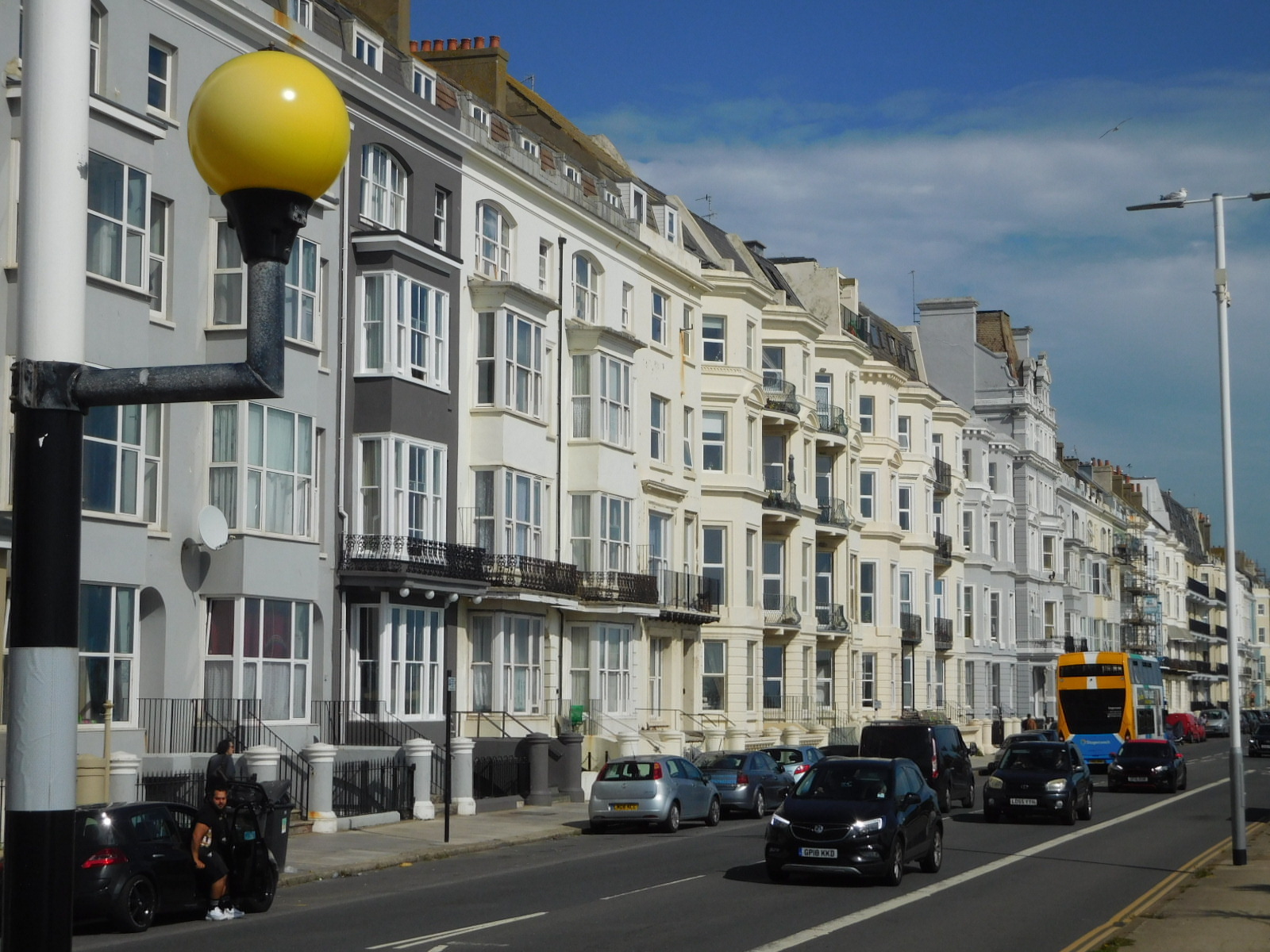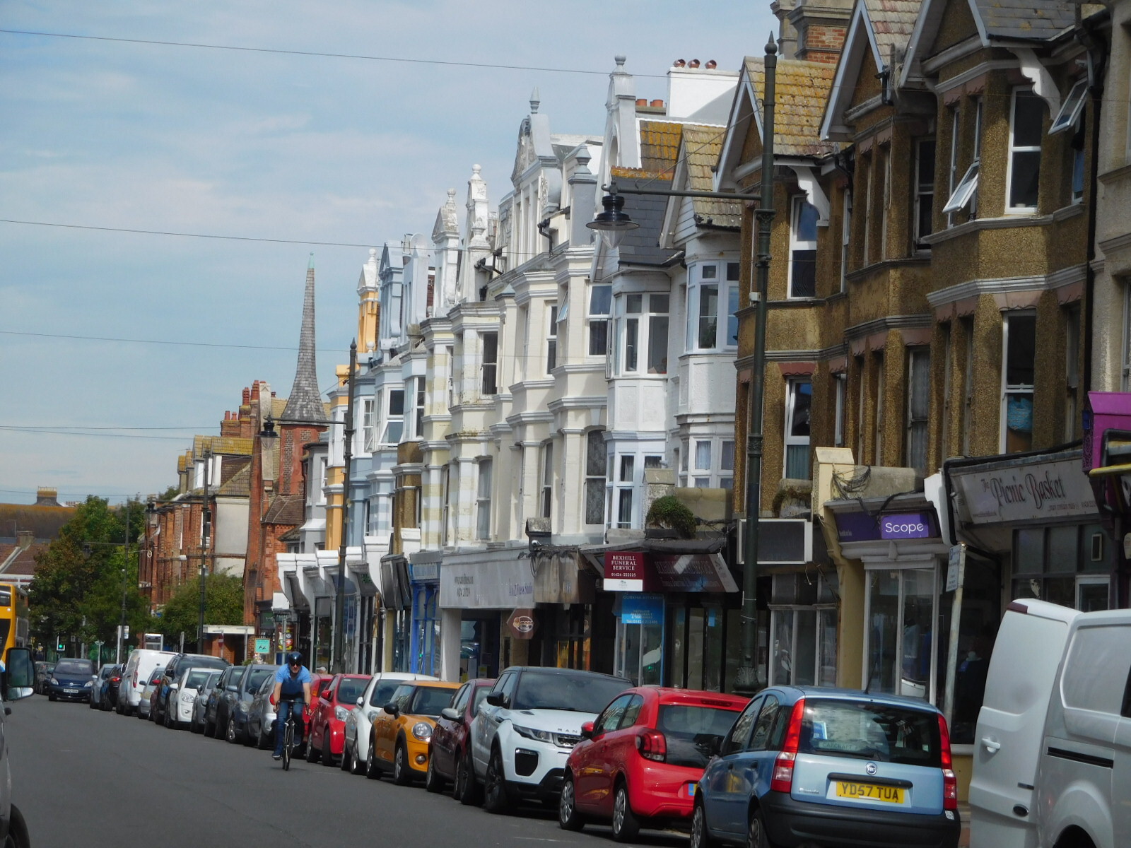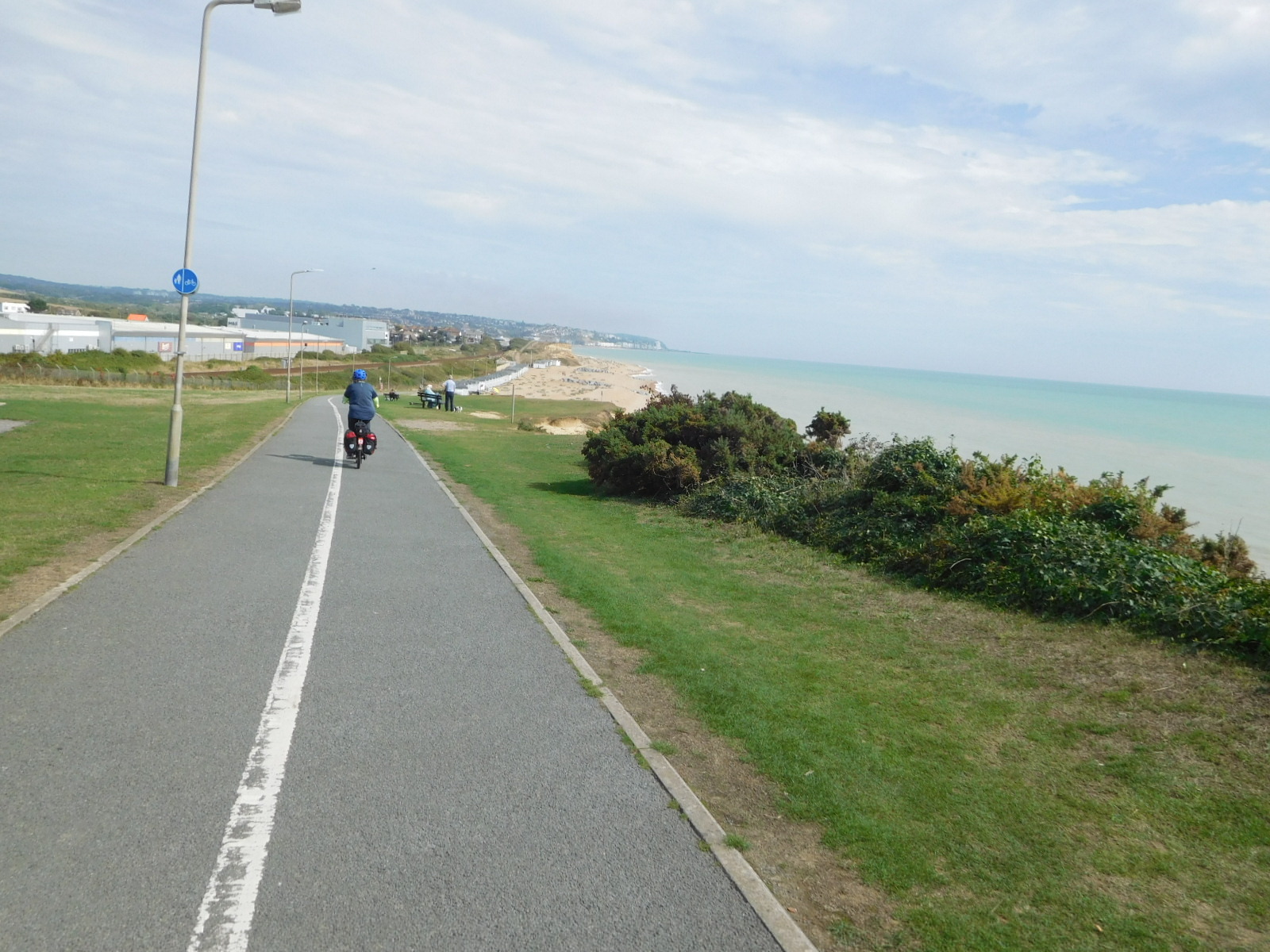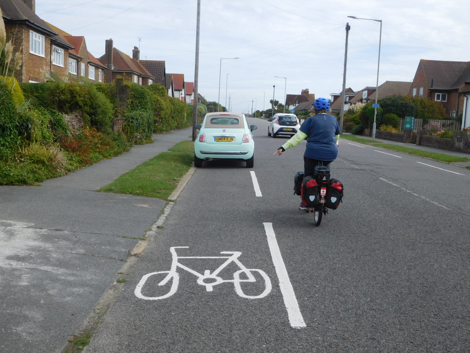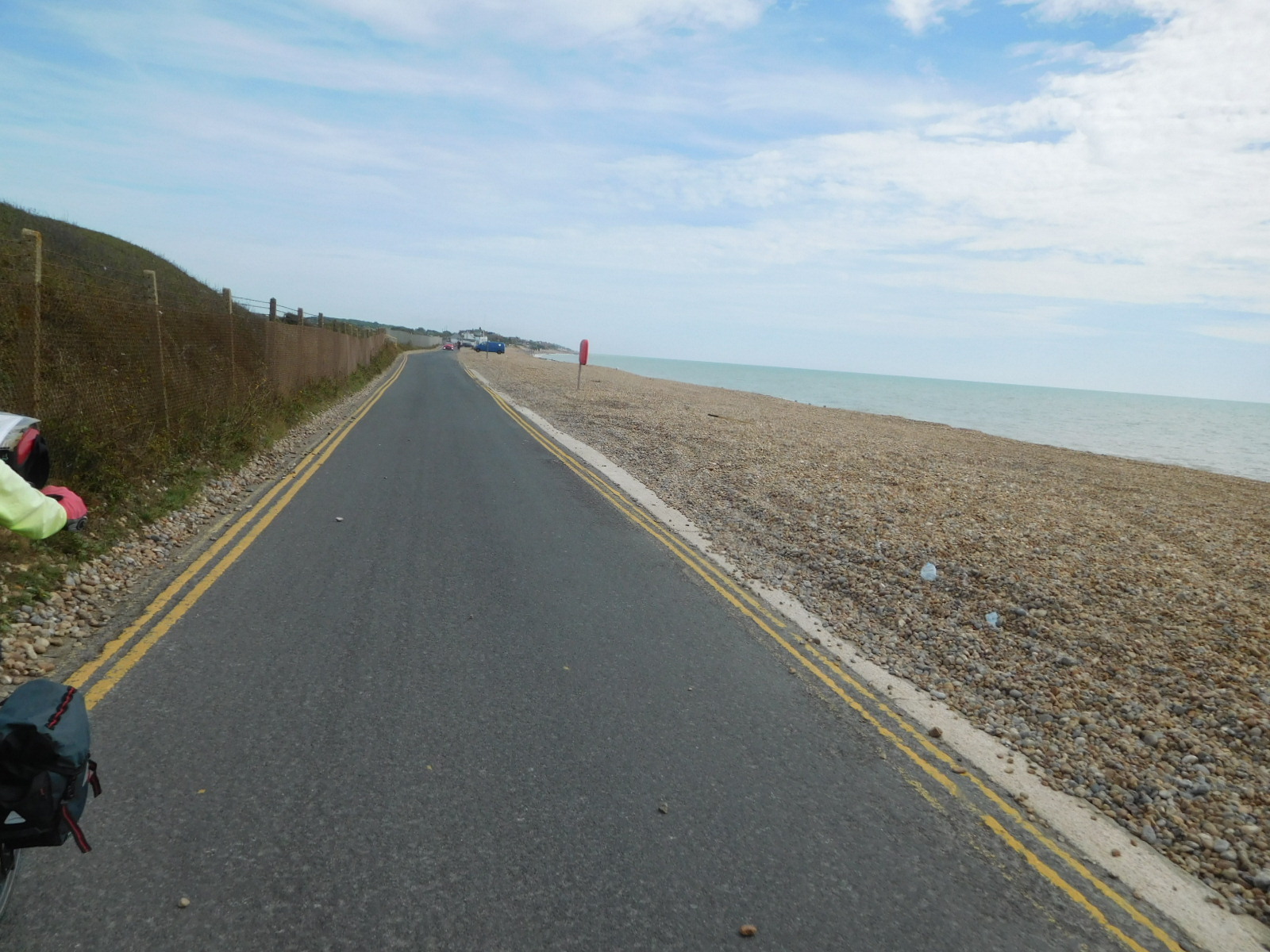Approaching Bexhill, we began to encounter the seaside style of buildings, and the other wonderful seaside things, like beaches and fish and chip stands. The road was also much wider, and we felt a bit of relief from the stress of a narrow road (where people also ride on the left (wrong!) side. Nevertheless you can see here in the photo the parked car in the bike lane, forcing us out further into any traffic.