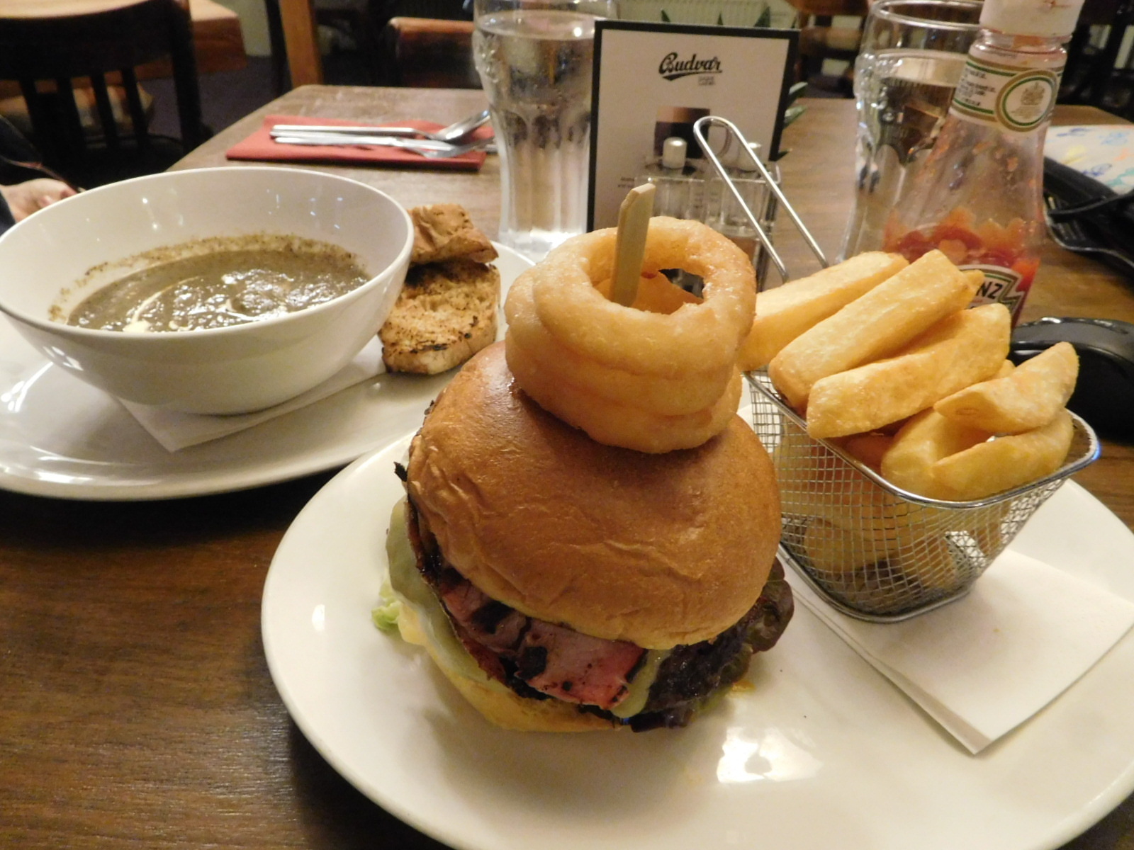 Back at our room, we decided to go down to the restaurant for some soup and a "Kahuna" burger. I was mostly keen to try some official British fries, but the burger was also excellent, as was the mushroom soup. Eventually on a Sunday we will find a "carvery", which is a tradition in pubs.