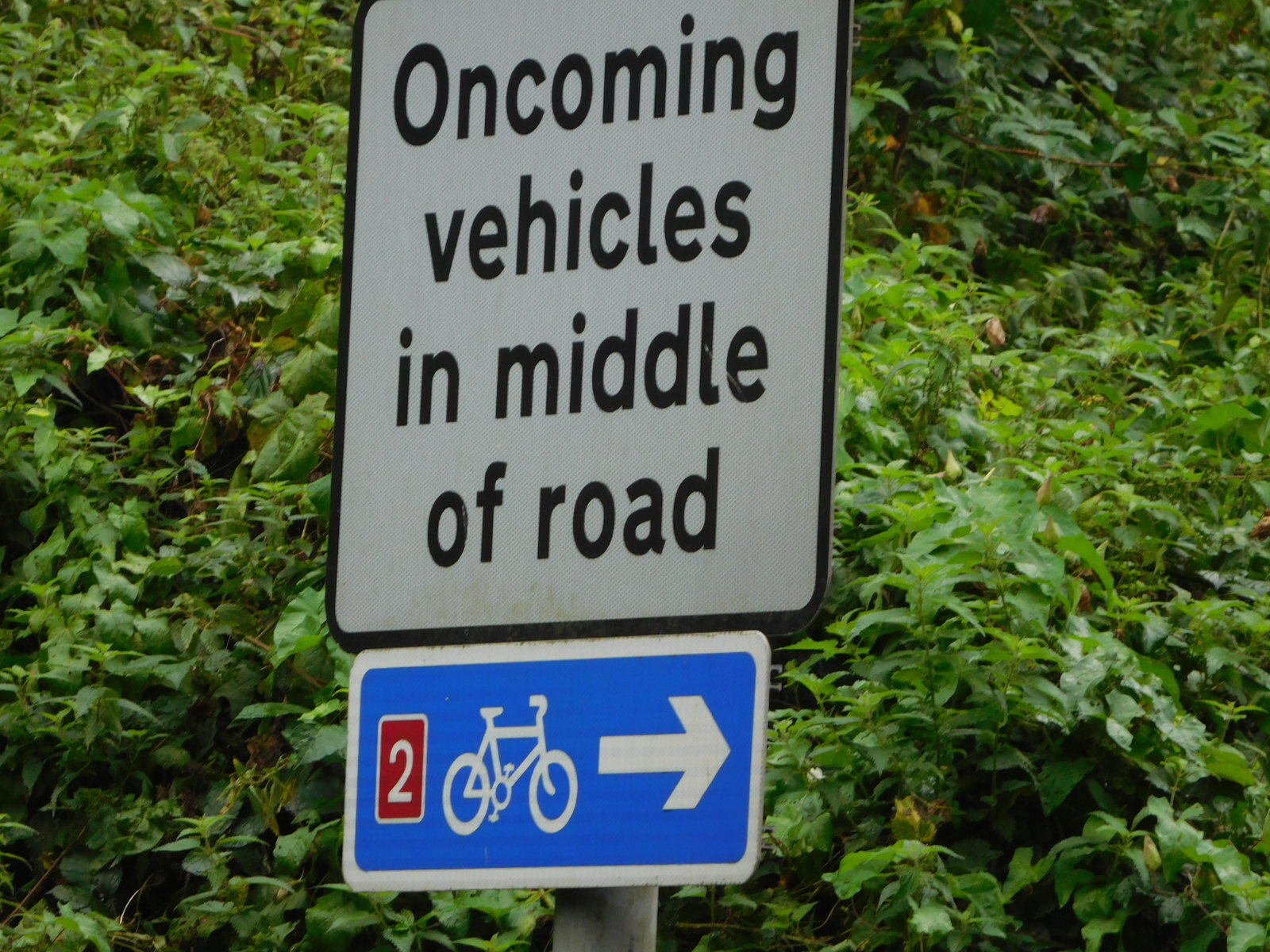 Despite the ease of crossing the road closure, we did continue to struggle with the English road situation through the day. It's not just the riding on the left side. The big problem is the general narrowness of the roads. This frequently means that even if cars are nominally over on their side, in practice they are swerving right toward you. The sign below acknowledges the problem at one point, on the National Cycle Network.
