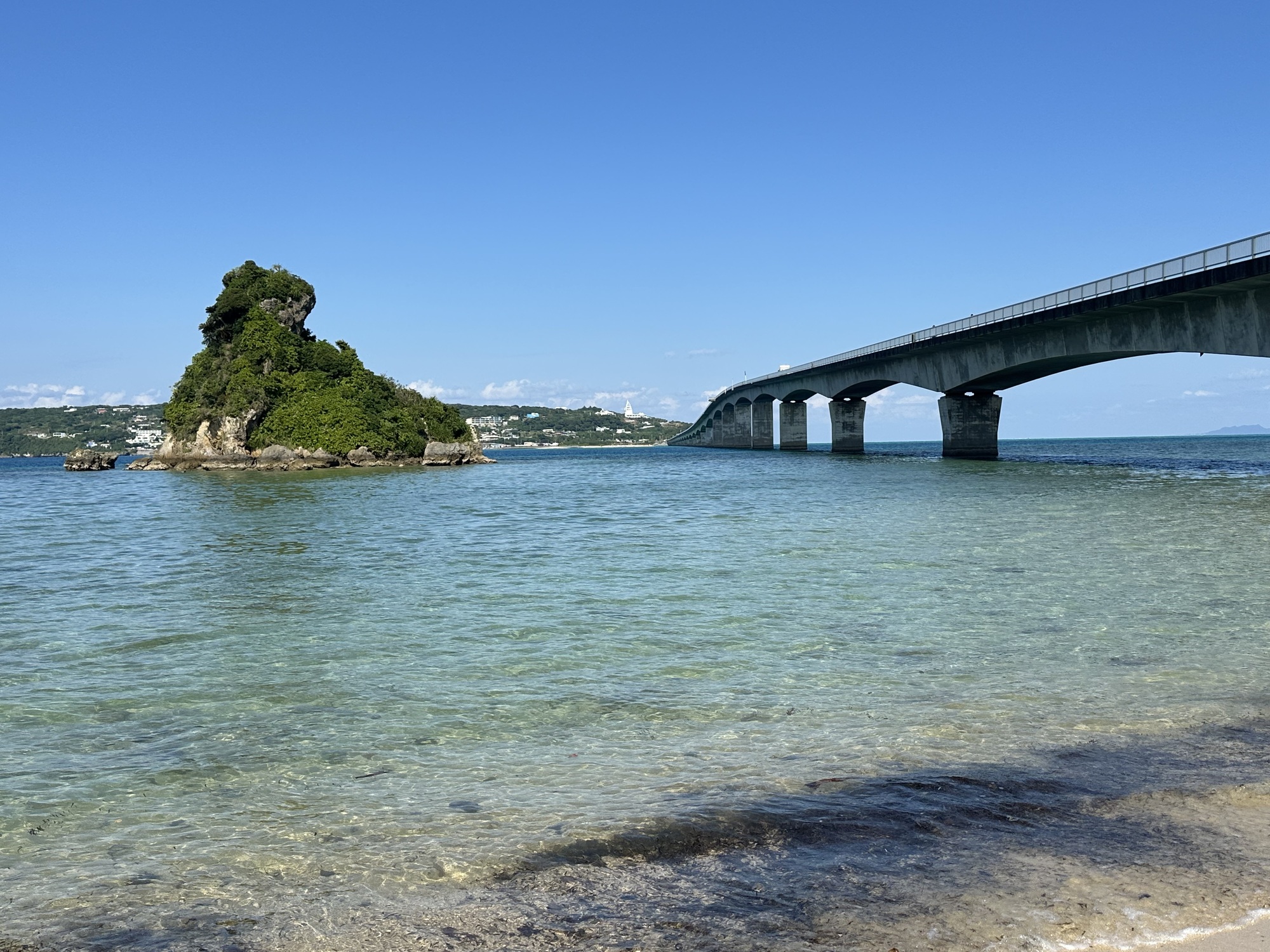Yagaji Island is connected to the main island by bridge. Kouri Island is north of Yagaji, and is also connected by bridge. The Kouri Island bridge is a tourist attraction in its own right, as it is remarkably long and striking looking for that reason. We crossed from Motobu to Yagaji, then onwards to the Kouri Island bridge. Another guest at our guesthouse had mentioned that you can sometimes see sea turtles from the bridge and to keep an eye out.