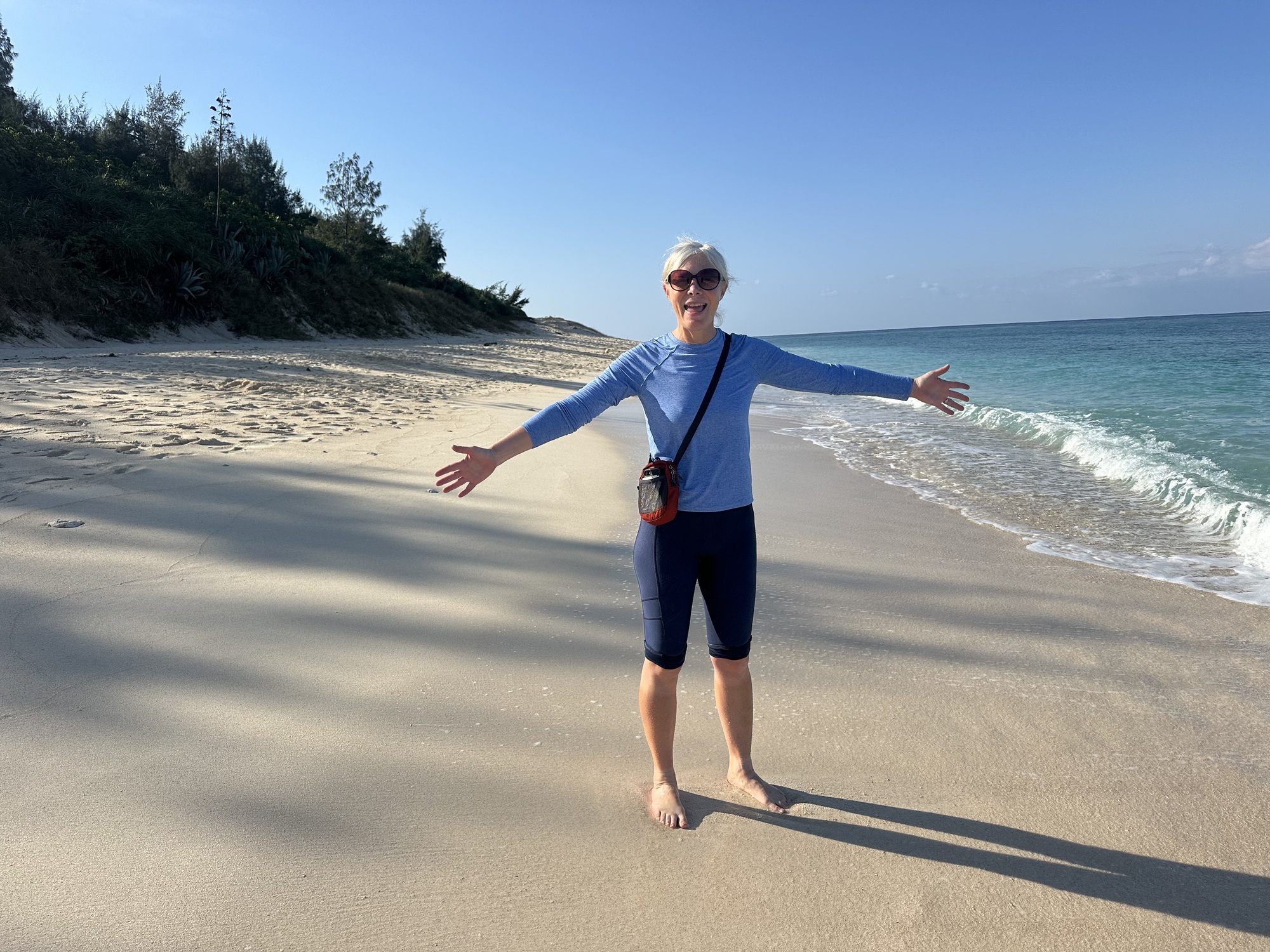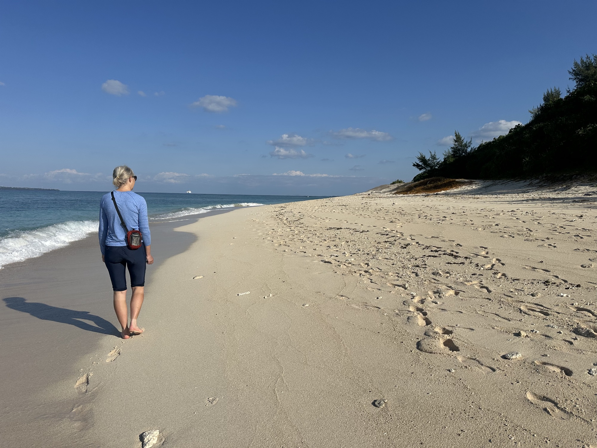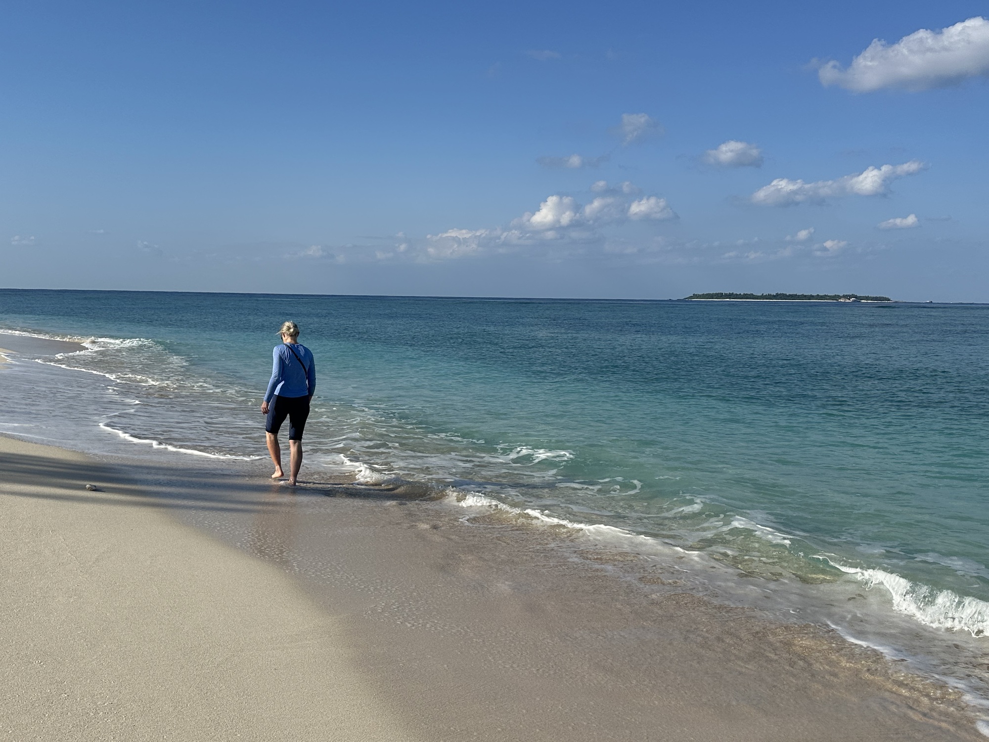 We did keep an eye out ans we crossed the bridge, and there were sea turtles! The water was clear and shallow, and occasionally these dark blobs on the bottom would surface and reveal themselves to be turtles. We spent a bit of time watching them surface and dive, then headed for the beach at the north end of the bridge, where Marilee could finally have the swim that was denied her on Sesoko.