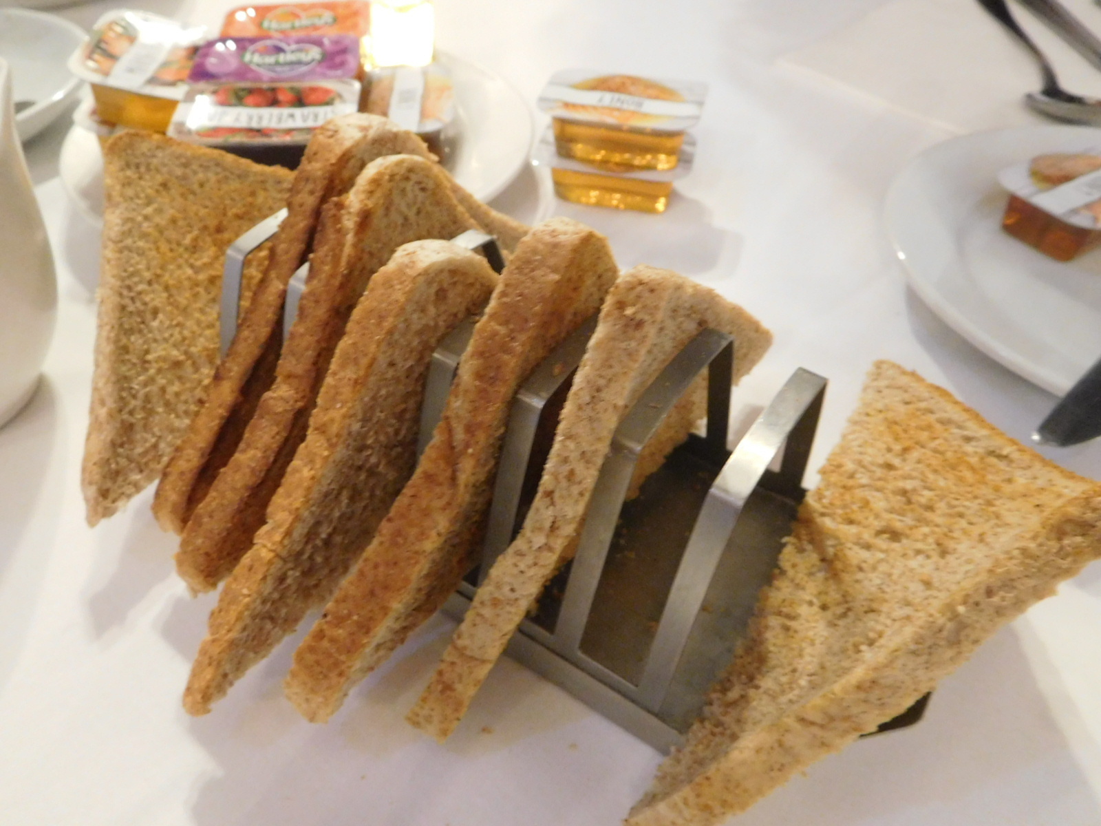 At least I could feel certain that the lame sliced factory bread offering could not be a tradition over 100 years old, since Wonder Bread was invented in 1921. The web site from the English Breakfast Society goes part way in explaining the breakfast components, but of course there is still no accounting for taste. They did give me the idea that maybe I could be asking for " baked halibut steaks, fried whiting, stewed figs, pheasant legs, broiled kidneys, pulled fowl, sheep’s tongues, potted pigeons, collared tongue, kidneys on toast, sausages with fried bread, pigs cheek and Melton pork pie, as well as the more familiar pork sausages, blood sausages, and bacon made in a regionally traditional way." It would serve me right if some of these items did come out of the kitchen!