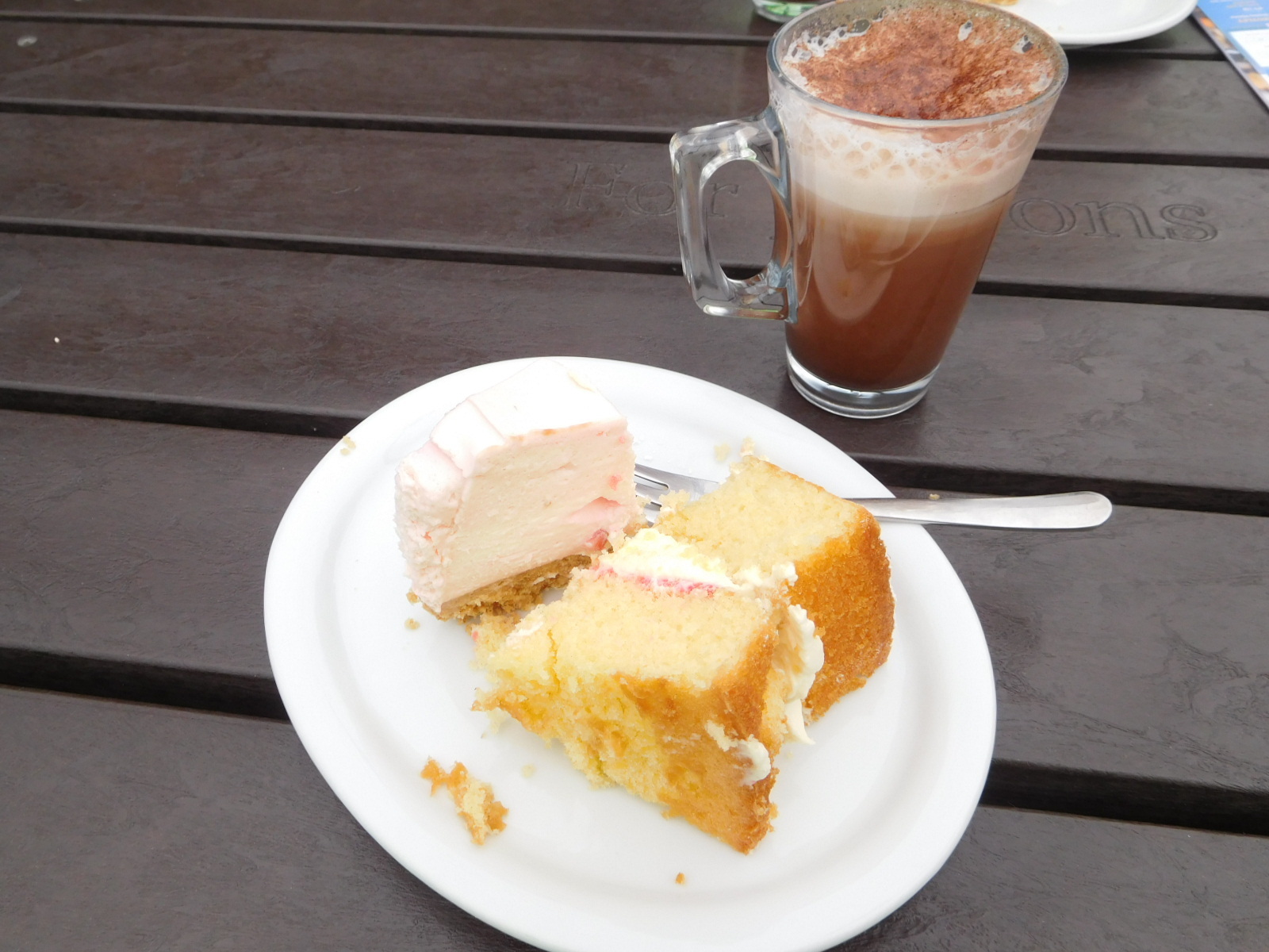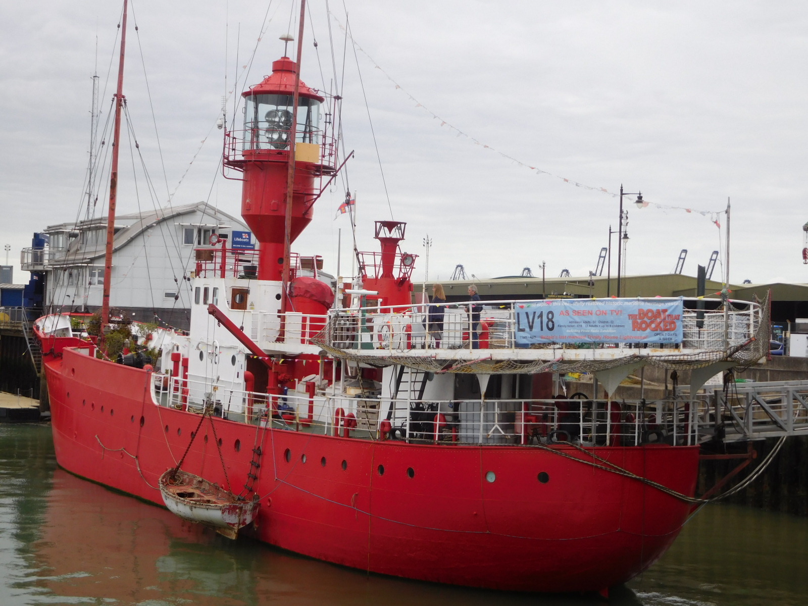 While the lady in the Mayflower display was telling me this extended story, Dodie had ordered "tea" at the little restaurant. For us this means hot chocolate and cream cakes. It was great sitting out on the pier and absorbing the ambiance. Nearby was a "lighthouse" ship, the last of its kind. This one was launched in 1958 and retired in 1994. Lighthouse vessels like this are still out there, but they are all unmanned and automatic.