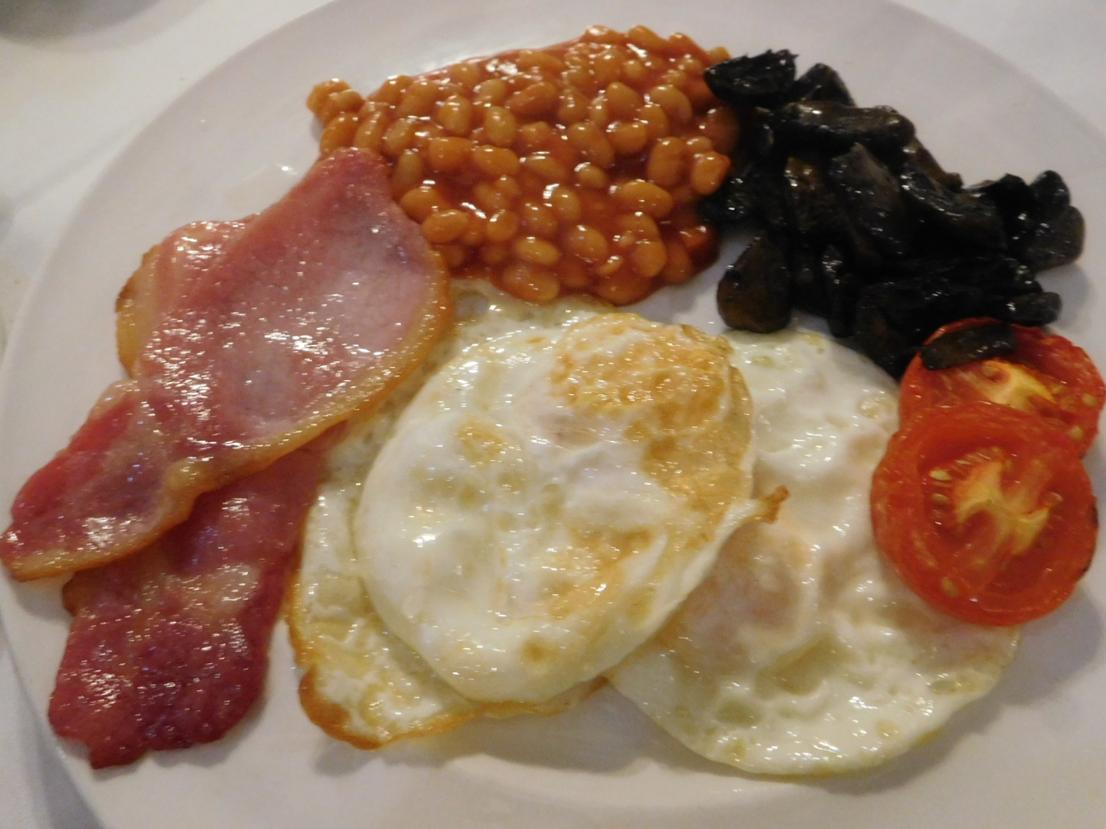 We went for breakfast in the dining room of our 15th century inn, and of course the offering was the full English breakfast, from which could be subtracted any items not desired. Black pudding and sausages are on my standard subtraction list. Looking then at what came, I found myself wondering about who first got the bright idea that such items as baked beans and stewed tomatoes were supremely suited to be in a breakfast standard. Of course, it's an unfair question, because there is no right and wrong in food preferences, only differences from country to country or among regions. But baked beans - really?