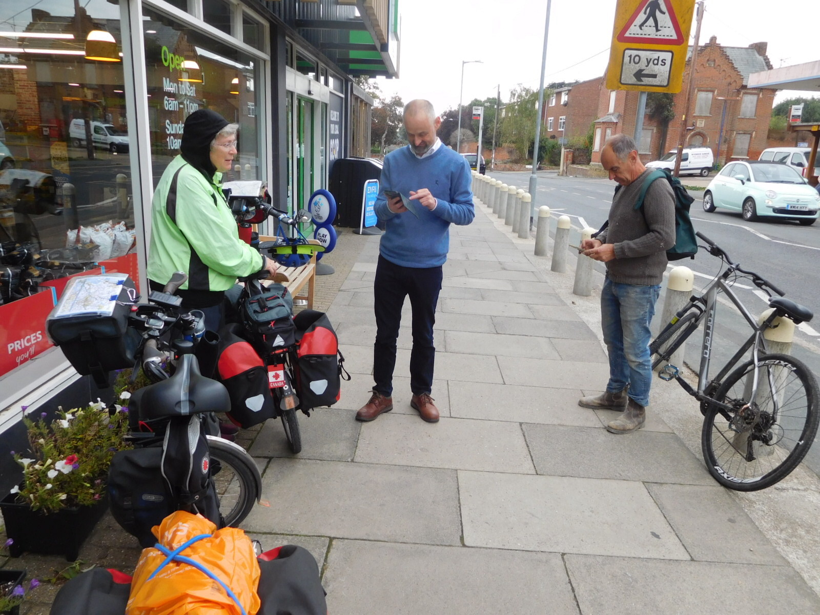 Whenever I am stationed outside a grocery store with the bikes, I attract people eager to ask the usual questions about what we are up to. Quite a few of these in England want to discuss the difficult conditions for cyclists. Outside the Coop I encountered a local baker who was also a cycling activist. Soon a friend came along, not a cycling activist but a carpenter, on a bike. These two chatted for a fair while, vicariously experiencing our trip. We set them up with a link to this blog, so they will be able to follow along and see how it turns out.