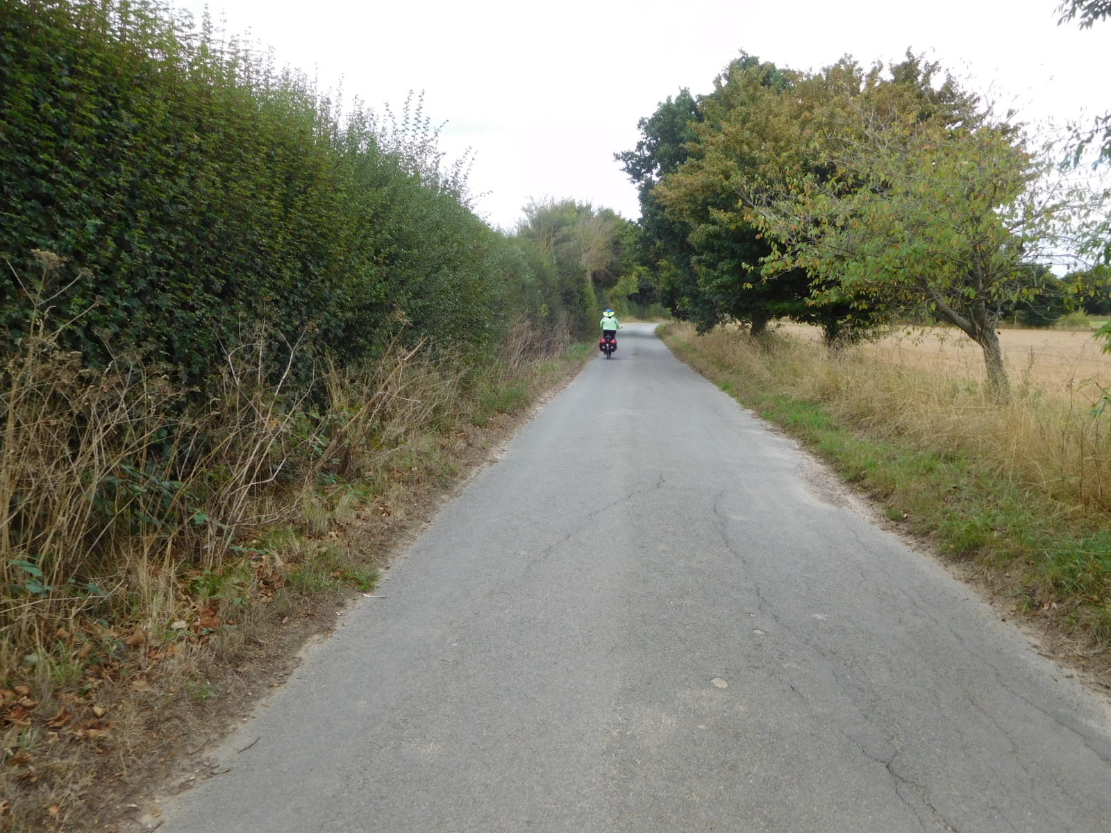 The countryside continued without any too spectacular scenery, but there was at least one thatched cottage, the kind of narrow but quiet roads that seem to work ok for us, open, harvested fields, and just a little in terms of orchards.