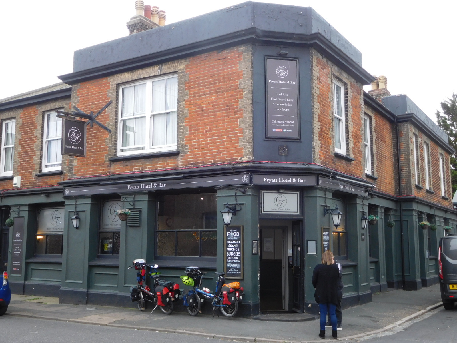 We found our way to our "pub" for the night, deep in Harwich. This is definitely a working town, and our room at the back of the pub reflects that. By moving the few bits of furniture around, we managed to fit the bikes in with us, to make a place where I could type on this computer, and to have a place for Dodie's glasses beside the bed. It was actually a bit of Tetris that we did not perfect until a little later in the evening.