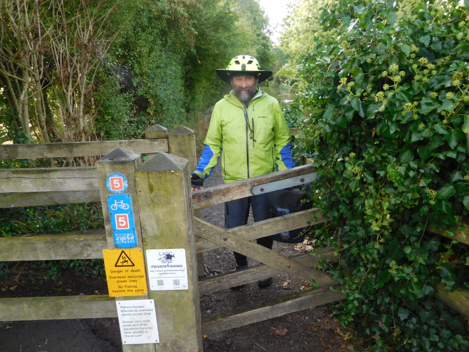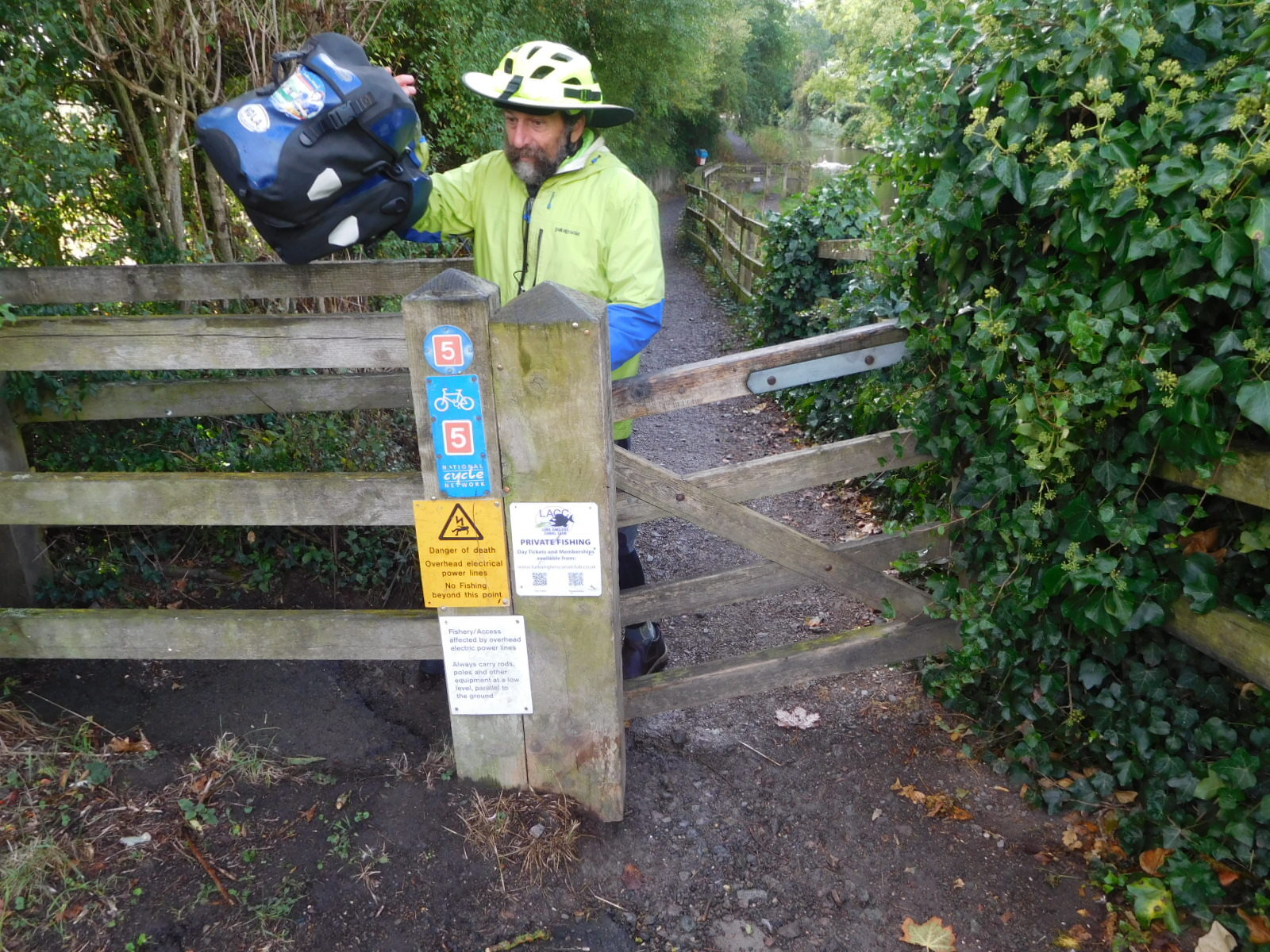 When the time came to leave the canal, we found the way barred by another devilish pedestrians mainly barrier. To get by this one there wa nothing for it but to remove our bags, and then to snake the trimmed down bags through the gate thing. It wasn't the end of the world, but just one more 20 minute time waster that contributes to not getting very far in a day. It also raises the blood pressure, particularly since you see the National Cycle Route sign so clearly right on the nasty barricade. We took note of where this was, so we could include it in a flame letter we will probably never send them. But a really complete letter would also cover all the missing signs, and the difficult to pass gates leading the hapless long distance cyclists through sheep pastures and onto bridle paths.