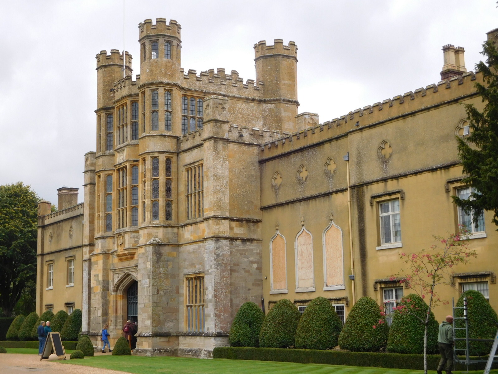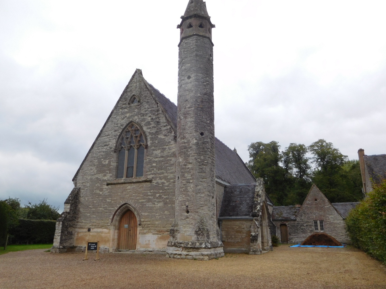 Near the town of Coughton, we noticed off to one side some fancy buildings or churches. We took a turn, through a gate that did mention something about "private road" but there was also a sign for tour bus parking, so it did not seem all that private. We passed the church with the unique tower, shown in the photo, an arrived at a castle like manor house.