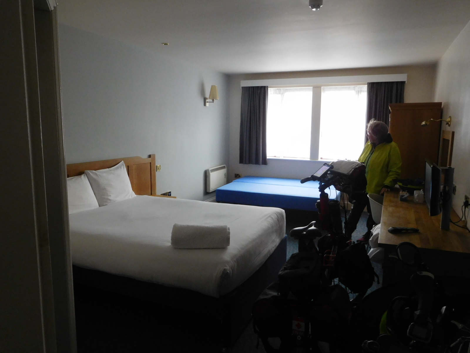 We booked a spot at the Ibis in Bromgrove. The room was not only cheap but very large, so we just rolled our bikes in. The Ibis has a good position for us, very close to the train station. Our plan is to use the train tomorrow, to get us through Birmingham, which is only 30 km away. We'll pop out on the other side, and keep pedaling. This could be our last chance to use the train this way, because a strike is scheduled to begin on Saturday.