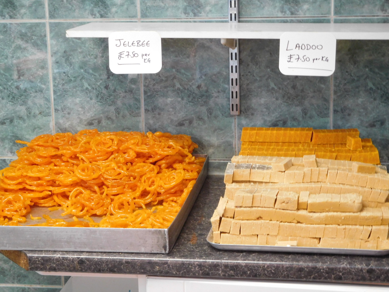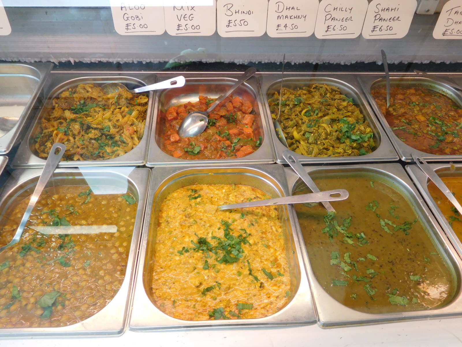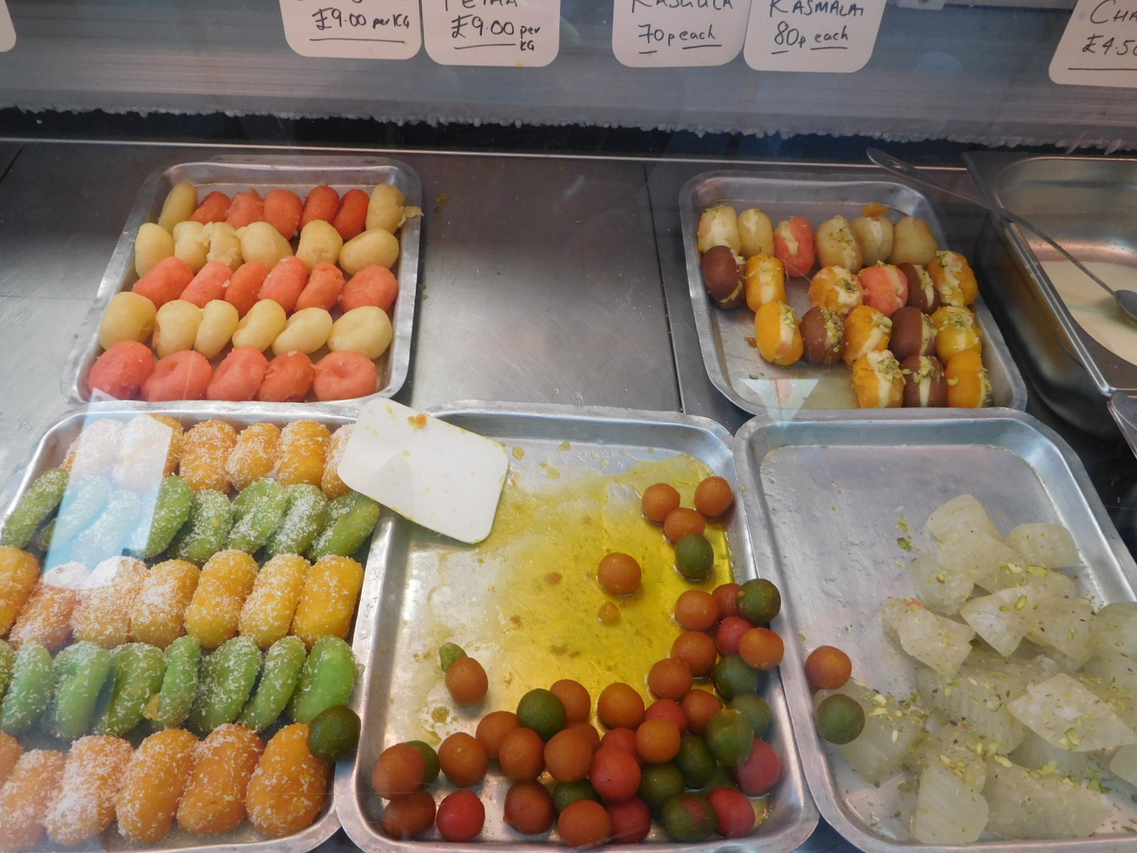 My favourite one was a kind of Punjabi bakery, shown below. They had a selection of gulab jamun type sweets, but with various different names, curries, and piles of samosas! I told the nice couple running the place about being from British Columbia, and of course they had relatives there, and could name places, like Surrey.