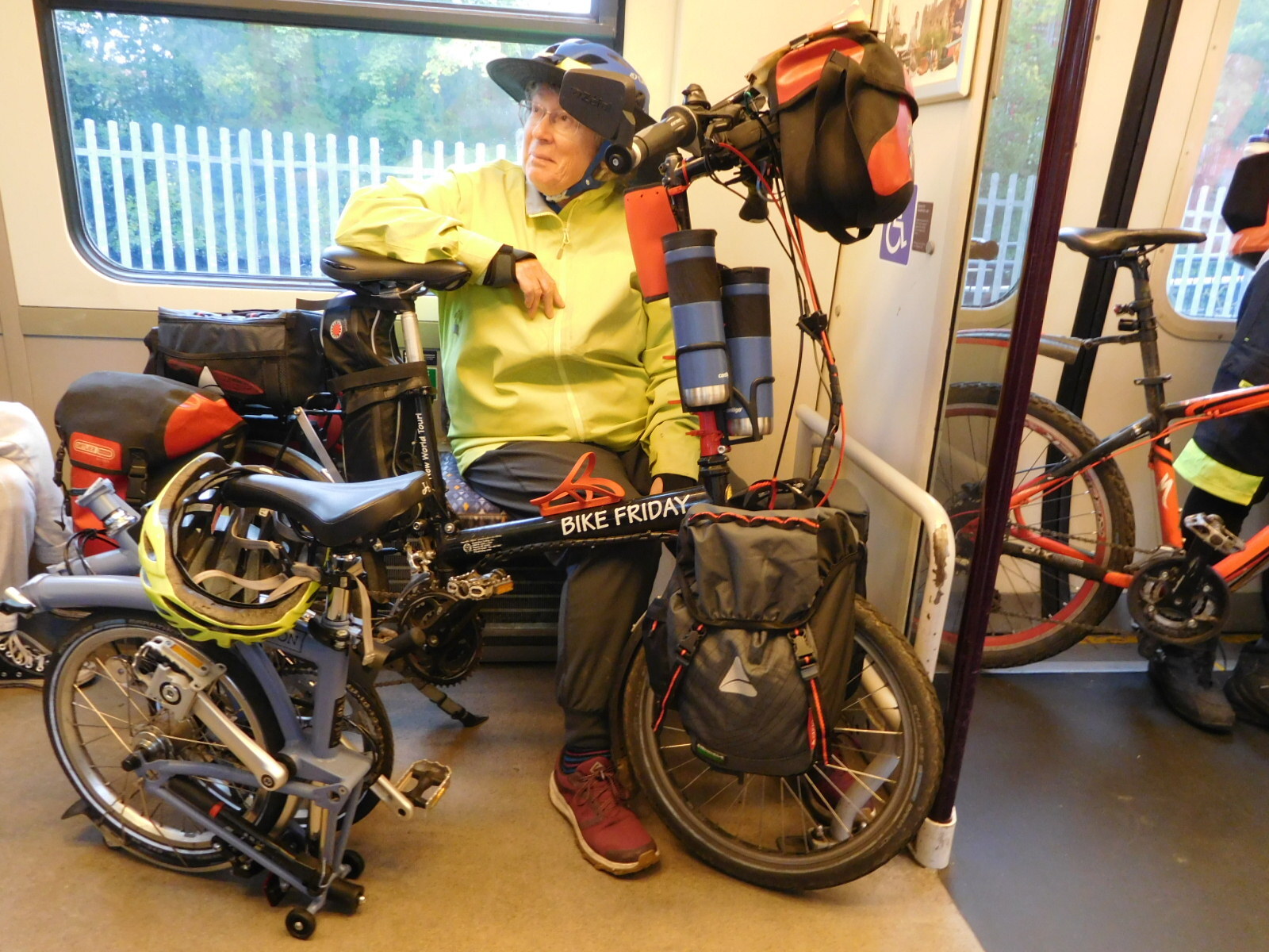 Very briefly a ray of light shone on this picture as a guy got on the train with a Brompton in one hand and a briefcase in the other. Brompton is a British folding bike that compresses to an incredibly small package. The guy set his bike down beside ours, easy for him because Bromptons have little auxiliary wheels that come into play when they are folded.